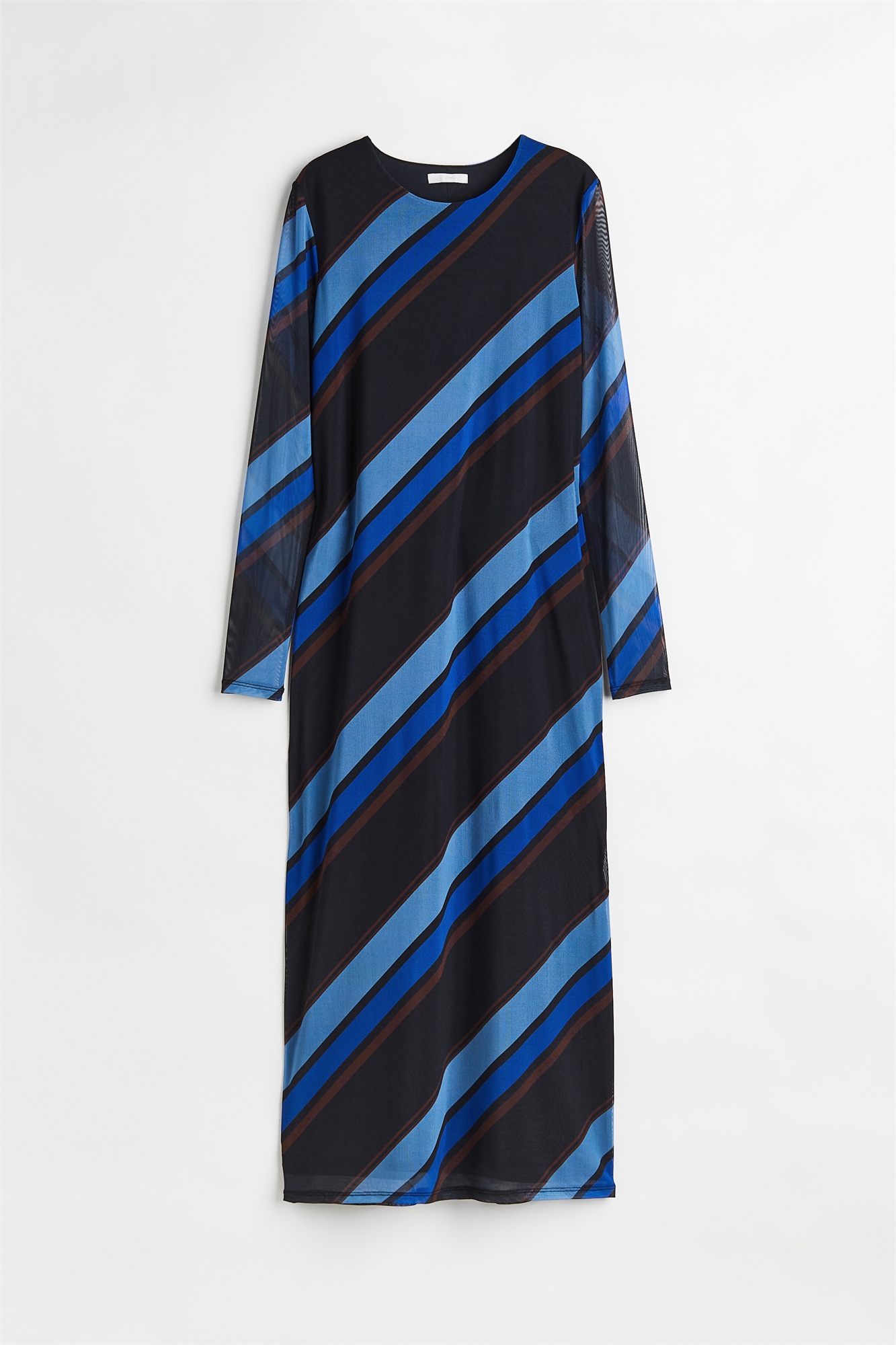 Платье прямого кроя из сетки длиной до колен с круглым вырезом, длинными рукавами и прямым подолом. Частично на подкладке.