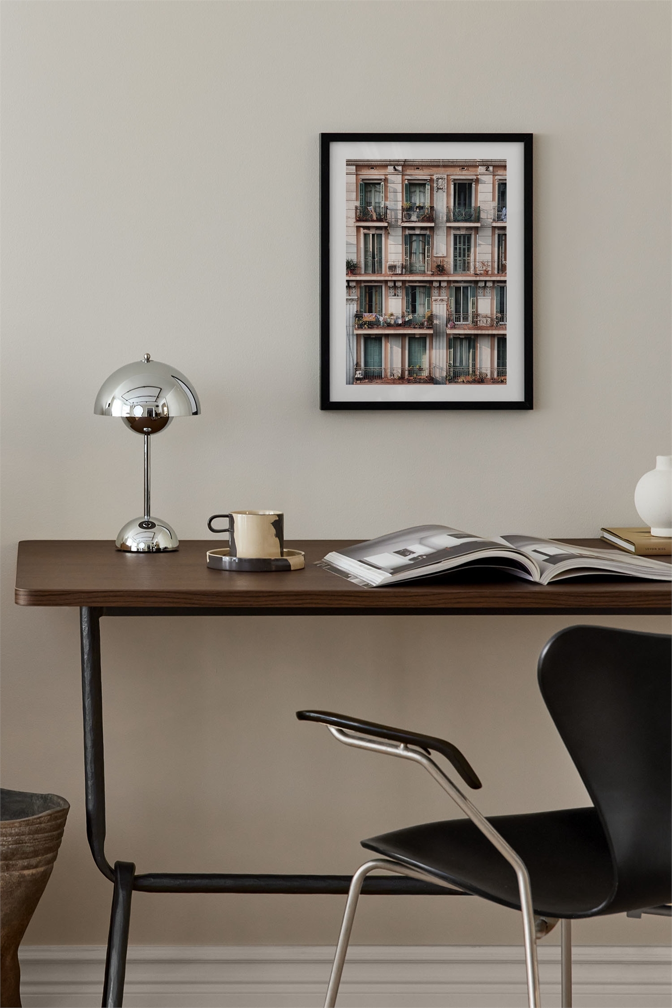 Фотография фасада дома с балконами в Барселоне. Элегантные детали дома и красивые цвета превращаются в фотоискусство, которое подходит как для классических, так и для современных домов. Встроенный пассаж элегантно обрамляет мотив.