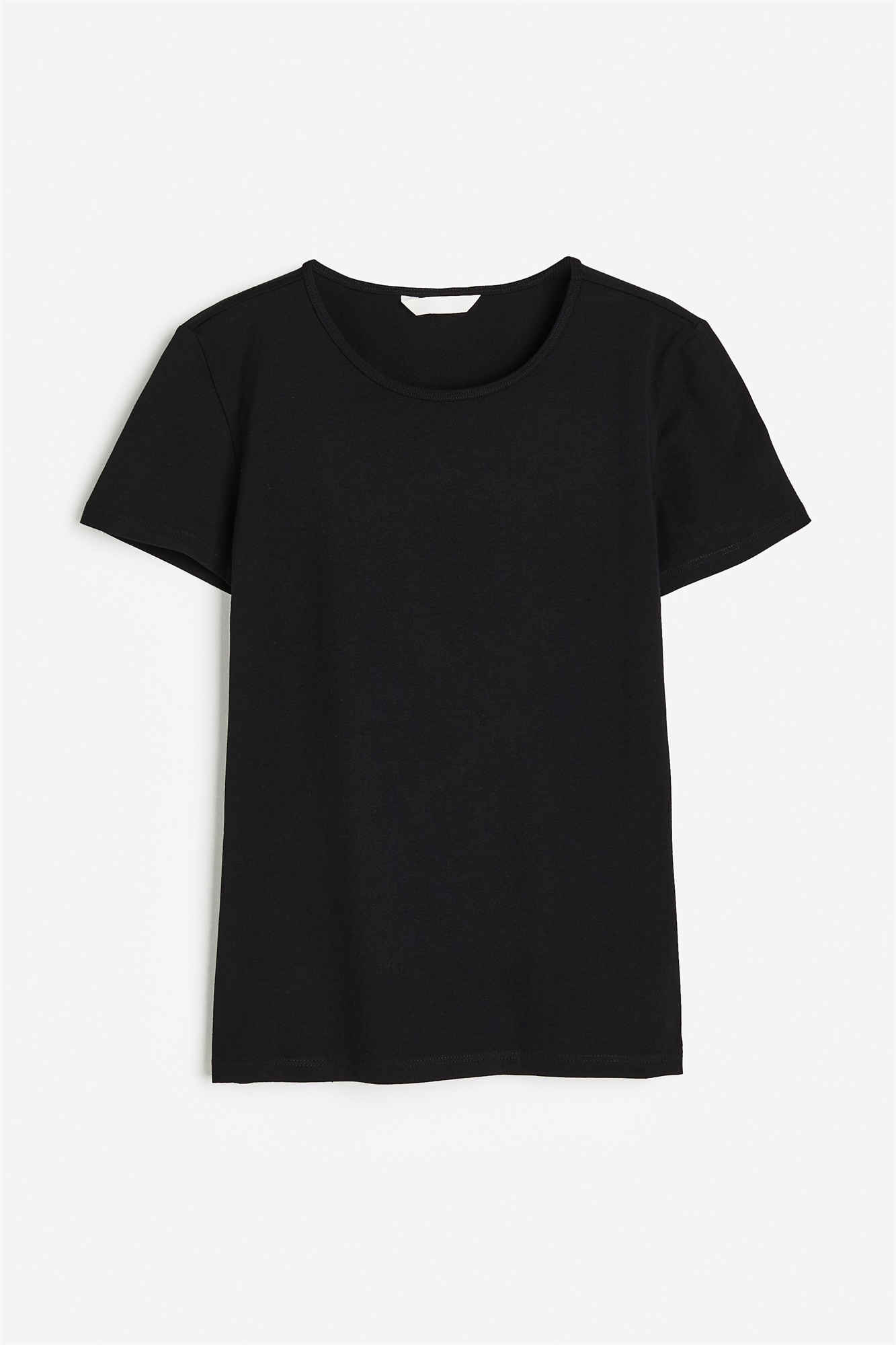 Облегающая футболка из мягкого хлопкового джерси с круглым вырезом и слегка спущенными плечами.