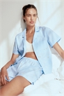 Пижама с рубашкой и шортами из мягкого хлопкового полотна. Рубашка с лацканами с вырезом, ярмом со складкой сзади и пуговицами спереди. Слегка спущенные плечи, короткие рукава и открытый нагрудный карман. Шорты с эластичной резинкой на талии и разрезами по бокам.