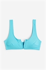 Бикини без подкладки, с широкими бретелями, небольшим V-образным отверстием спереди и чашечками со съемными вставками, придающими форму бюсту и обеспечивающими хорошую поддержку. Без застежек.