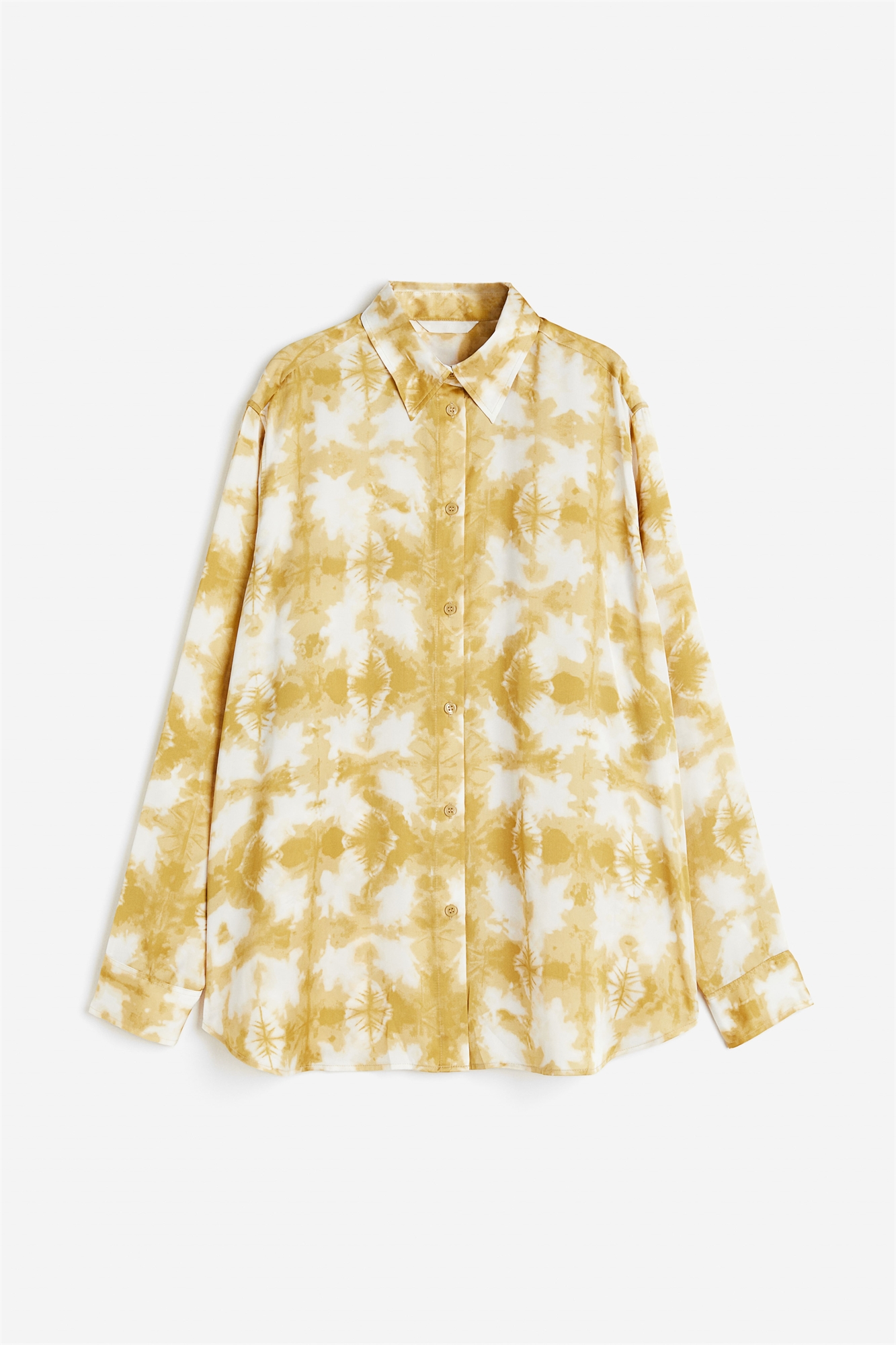 Блузка оверсайз из тканого материала с легким блеском. Воротник, застежка на пуговицы спереди и двухслойная стойка с коробчатой складкой сзади. Слегка спущенные плечи и длинные рукава с манжетами на пуговицах. Аккуратный закругленный подол.