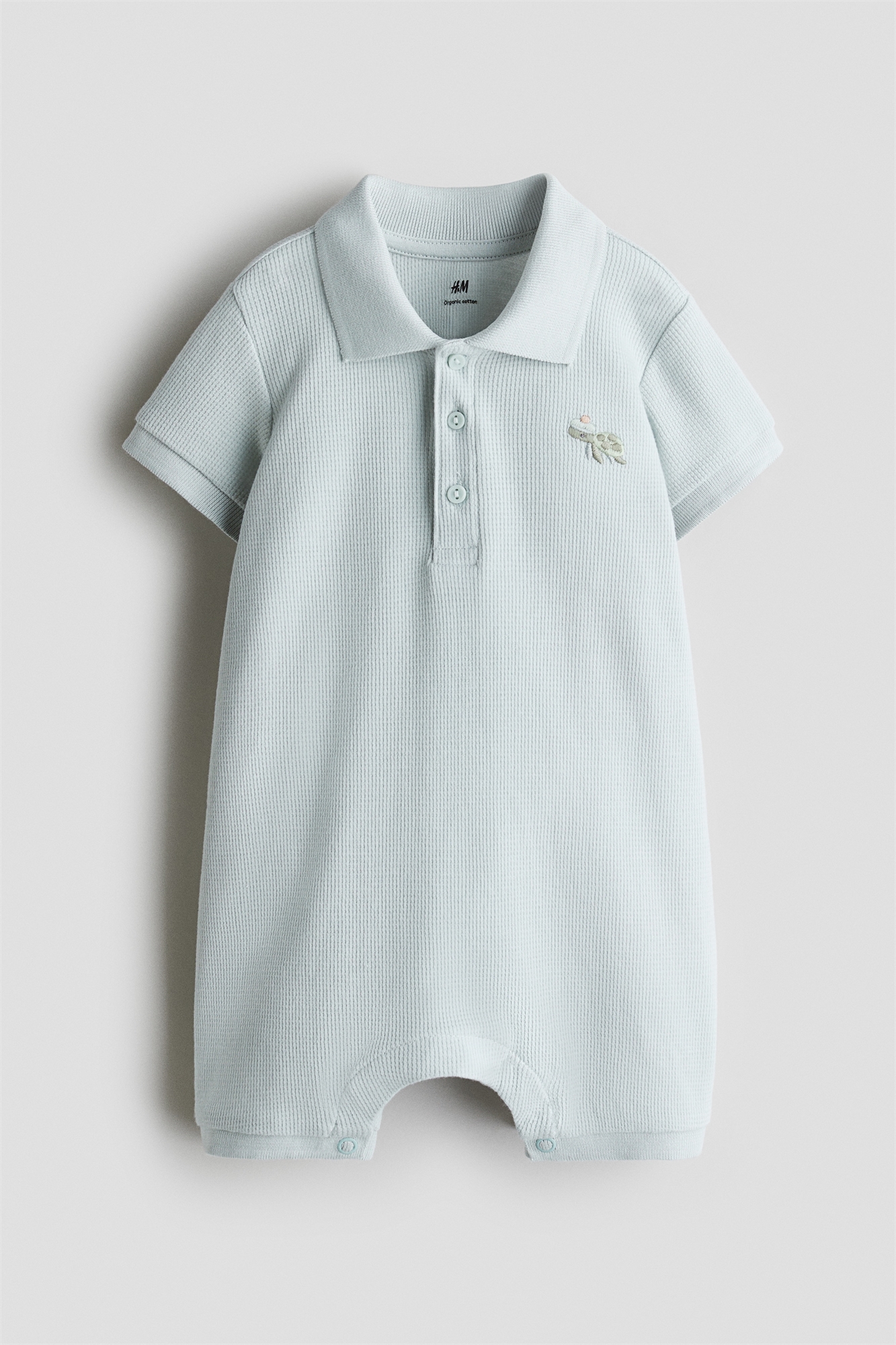 Свободный комбинезон-ромпер из мягкого вафельного хлопкового джерси с ребристым воротником, застежкой на пуговицы спереди и открытым нагрудным карманом. Короткие рукава и короткие ноги с окантовкой на манжетах и подол. Скрытые кнопки в промежности и по ногам для удобства переодевания.