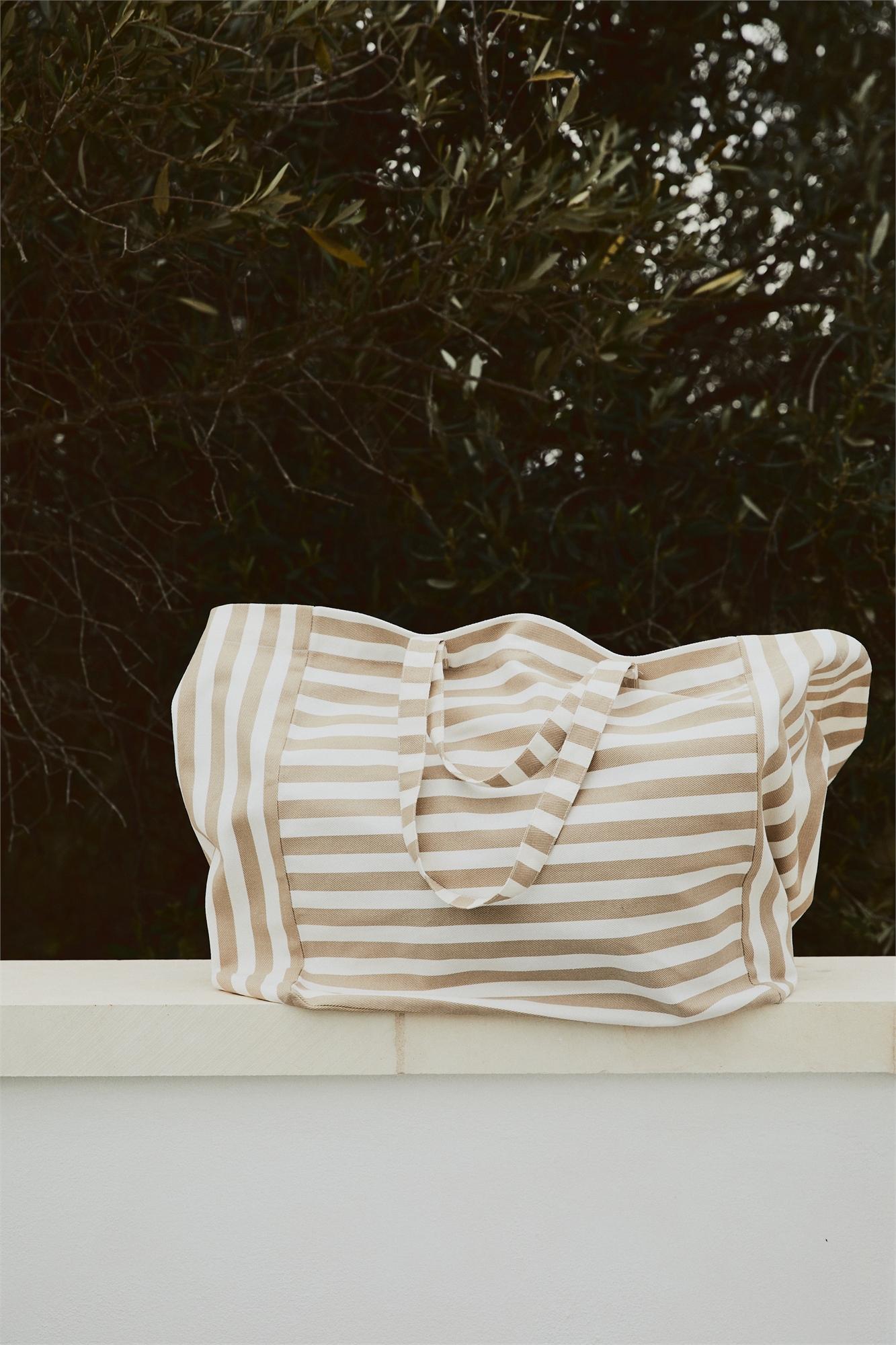 Просторная пляжная сумка из прочного хлопкового холста с двумя парами ручек сверху и завязками по длинным сторонам, которые можно застегнуть через верх. Одно внутреннее отделение. Без подкладки. Глубина 30 см. Ширина 40 см. Высота 42 см.