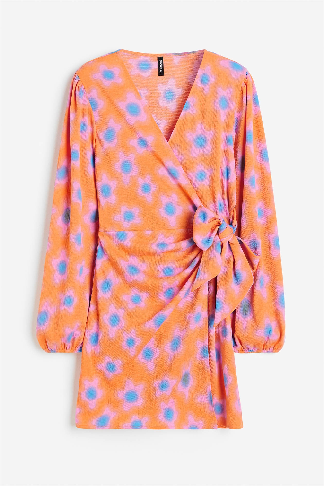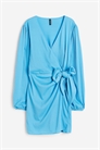 Короткое приталенное платье из мятого джерси с V-образным вырезом горловины и облегающим передом с широкими завязками с одной стороны и узкими потайными завязками с другой. Длинные рукава-баллоны с узкой резинкой на манжетах.