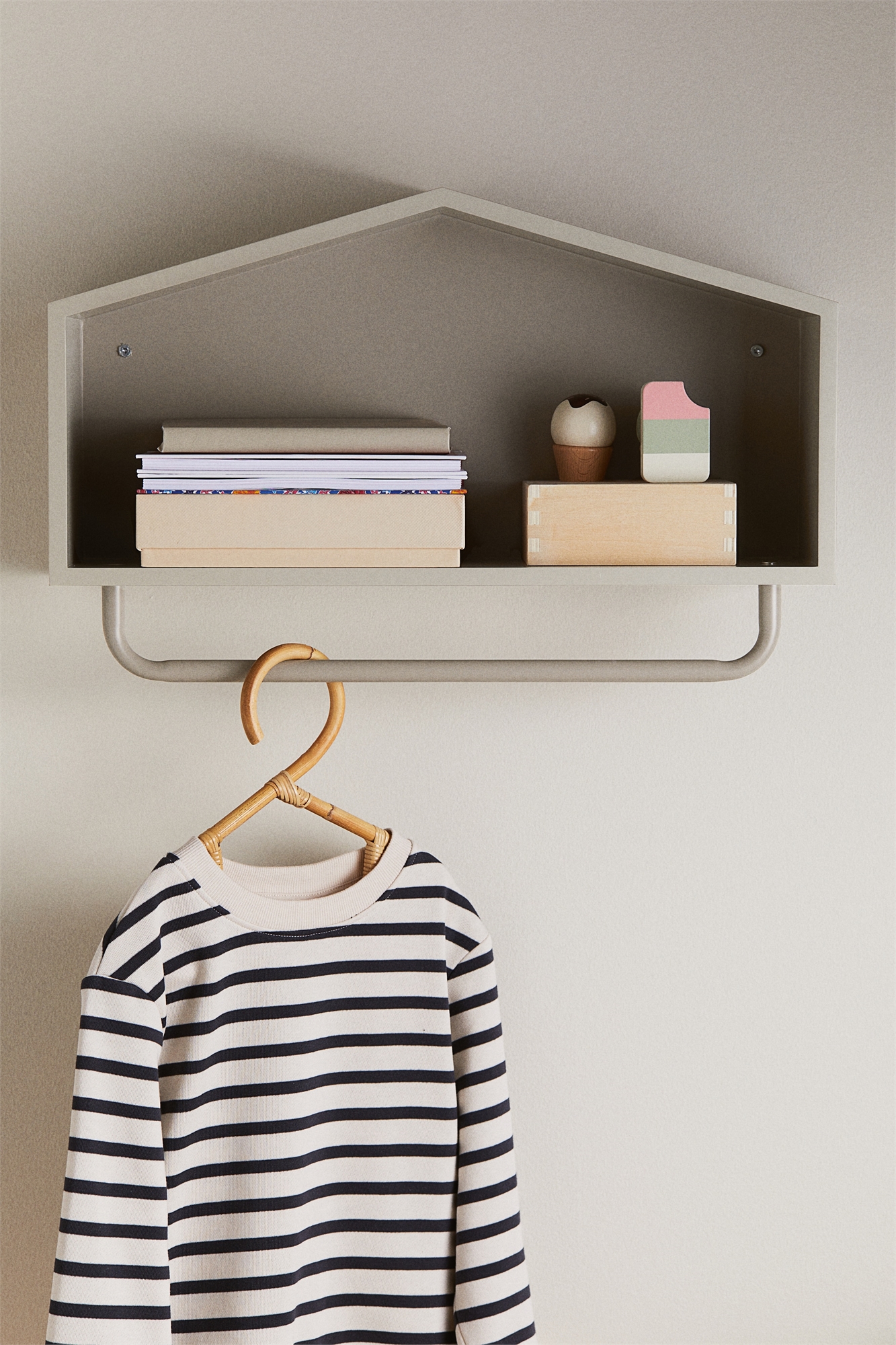 Настенная полка в форме домика из МДФ, которая добавит игривую деталь в любую детскую комнату. Одна полка и металлическая труба подходящего цвета под ней для дополнительного места для вешалок. Готова к сборке. Шурупы в комплекте. Глубина 15 см. Высота 32,8 см. Длина 52 см.