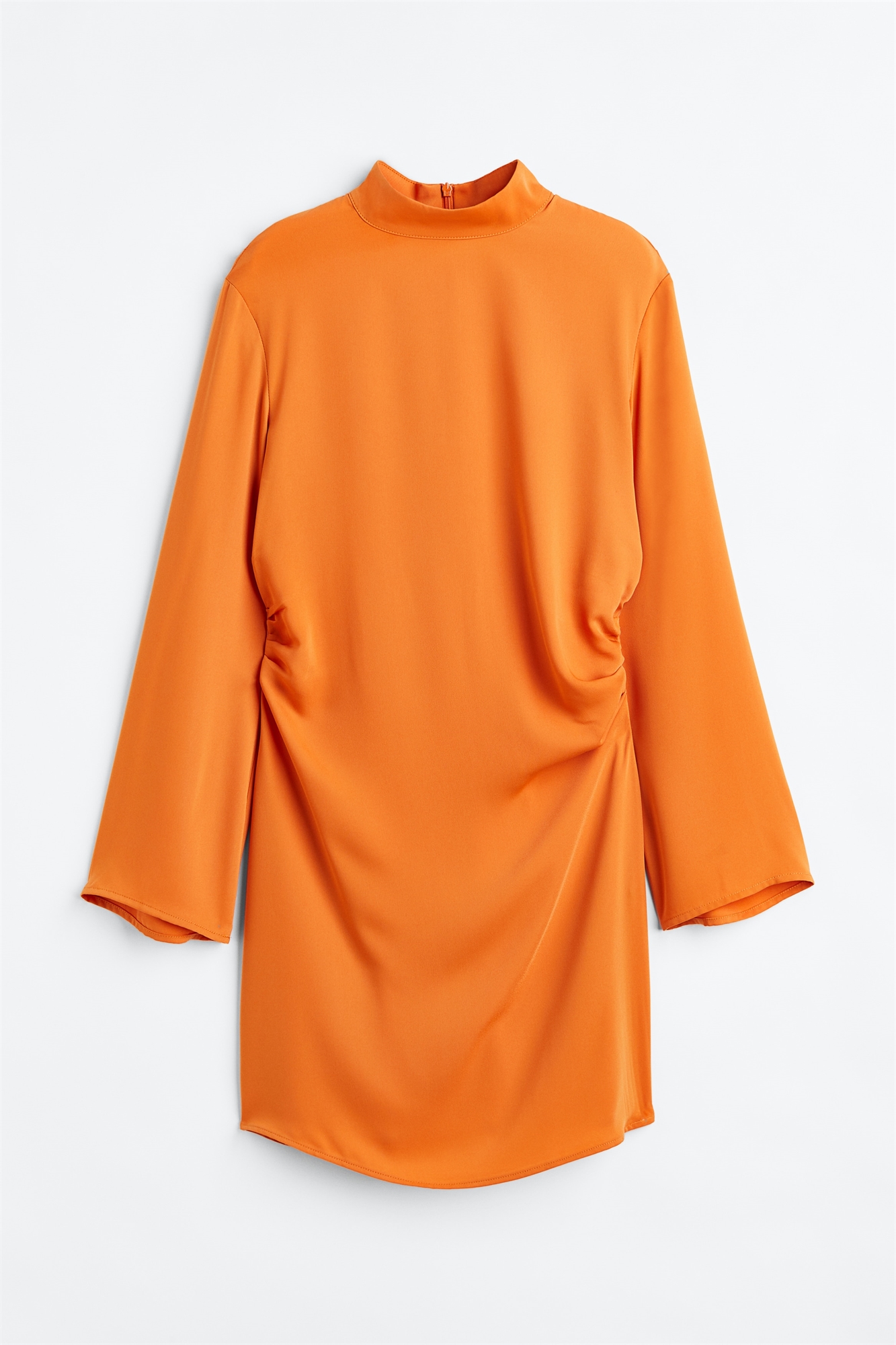 Короткое платье из тканого материала с воротником-стойкой и потайной застежкой-молнией сзади. Слегка спущенные плечи, длинные рукава и сборки по боковым швам на талии для эффекта драпировки. Без подкладки.