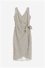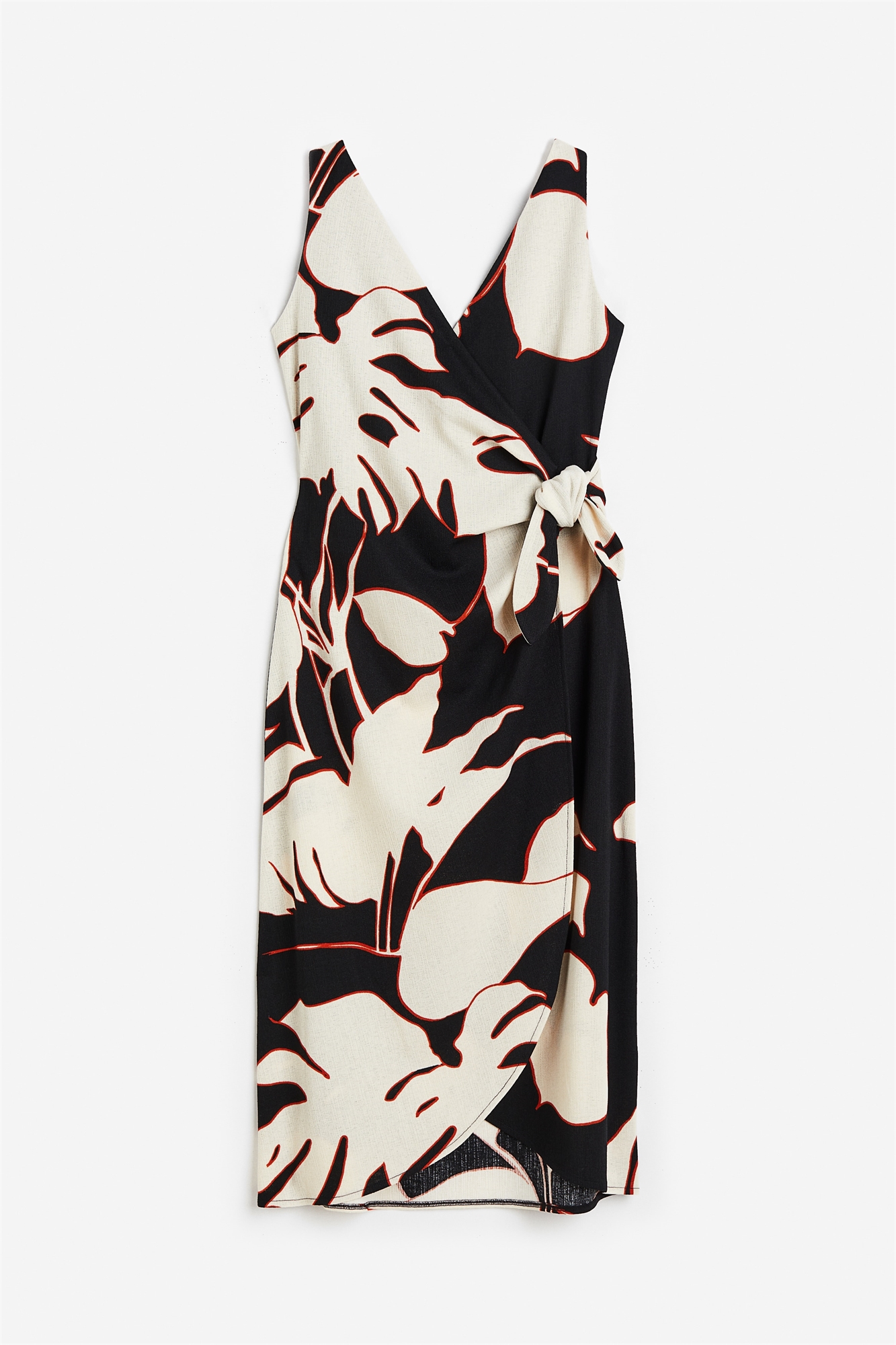 Платье длиной до колена и без рукавов из джерси с глубоким V-образным вырезом спереди и сзади. Приталенный фасон с плиссированным передом с широкими завязками с одной стороны и потайной пуговицей с другой.