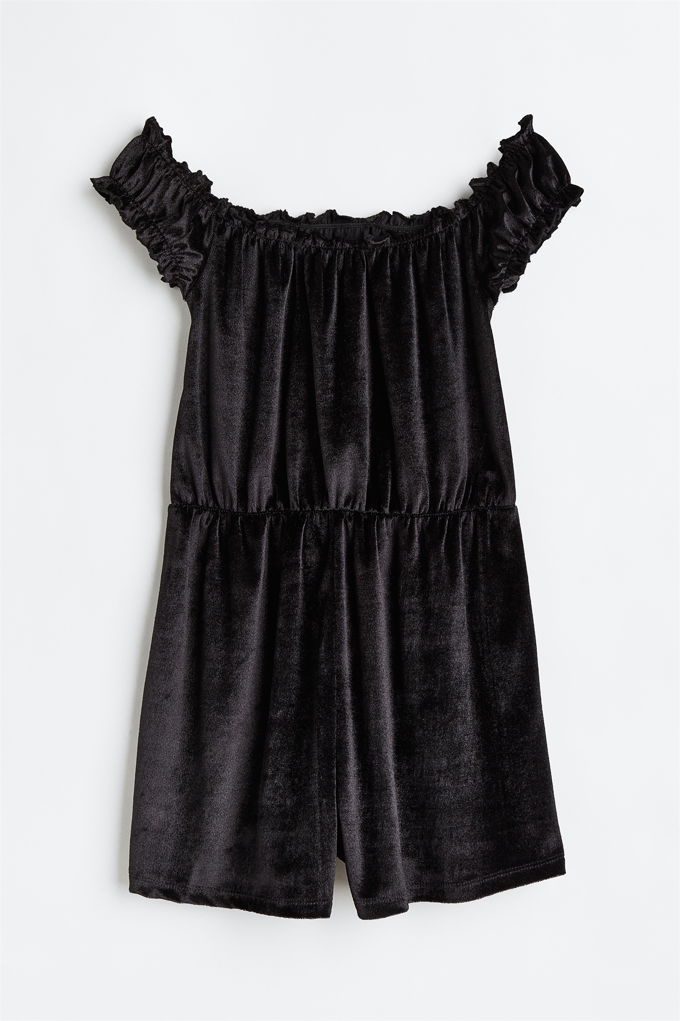 Велюровый комбинезон на плечах из мягкого велюра с короткими пышными рукавами и сборкой на талии. Узкая эластичная резинка и небольшая оборка по вырезу горловины и рукавам. Без подкладки.