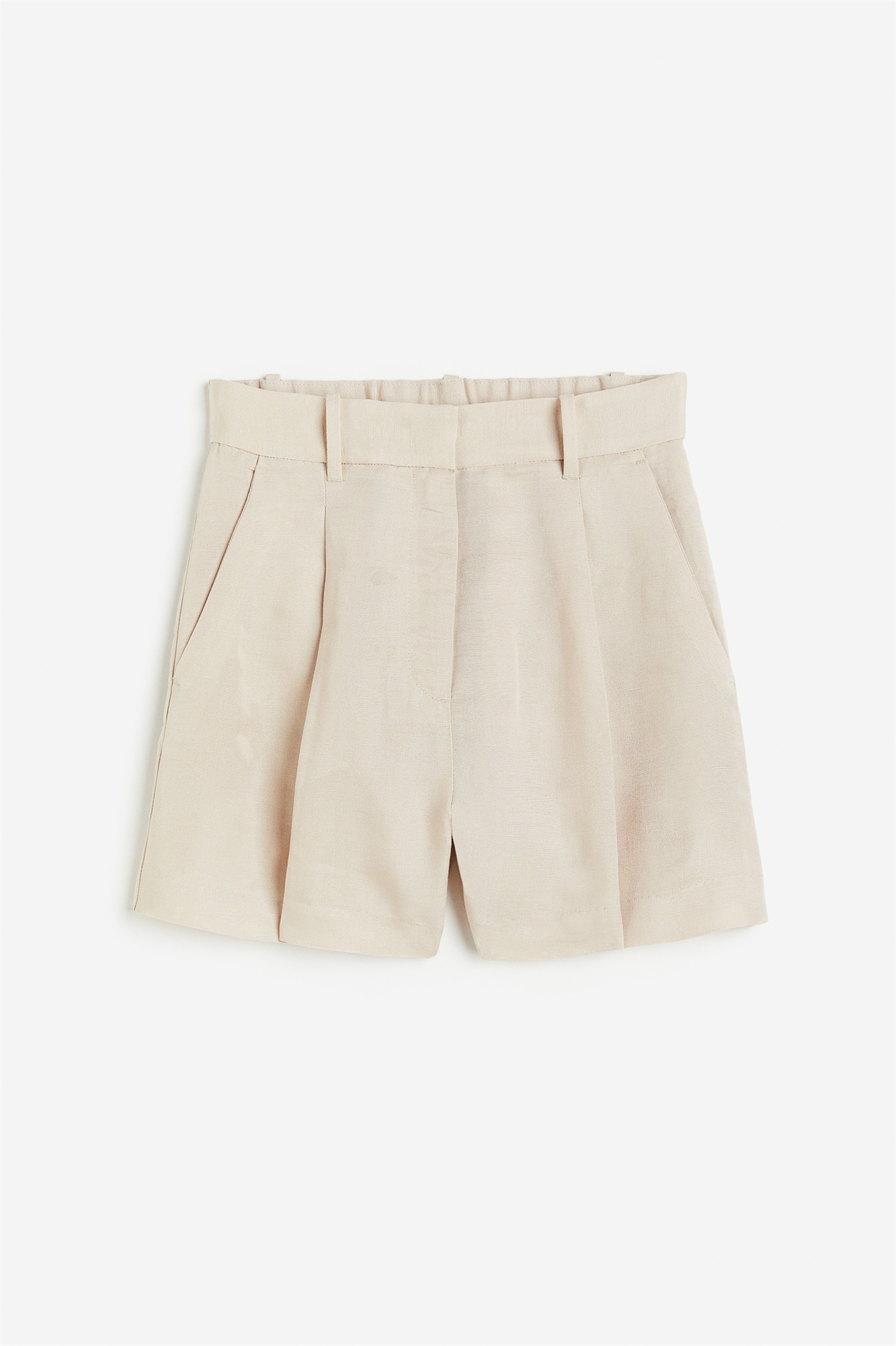 Приталенные шорты из льна и вискозы. Высокая талия с утяжкой сзади и удлиненным поясом со скрытой застежкой на пуговицы и крючки. Ширинка на молнии и диагональные боковые карманы. Ноги со складками в верхней части и складками спереди и сзади.