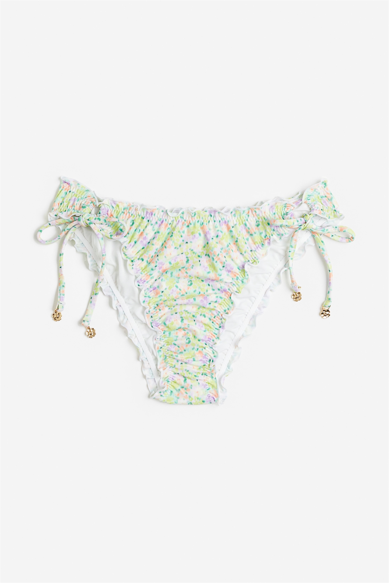 Трусики-бикини на подкладке, со средней талией, завязками с жемчужными пластиковыми бусинами по бокам и вырезом сзади.