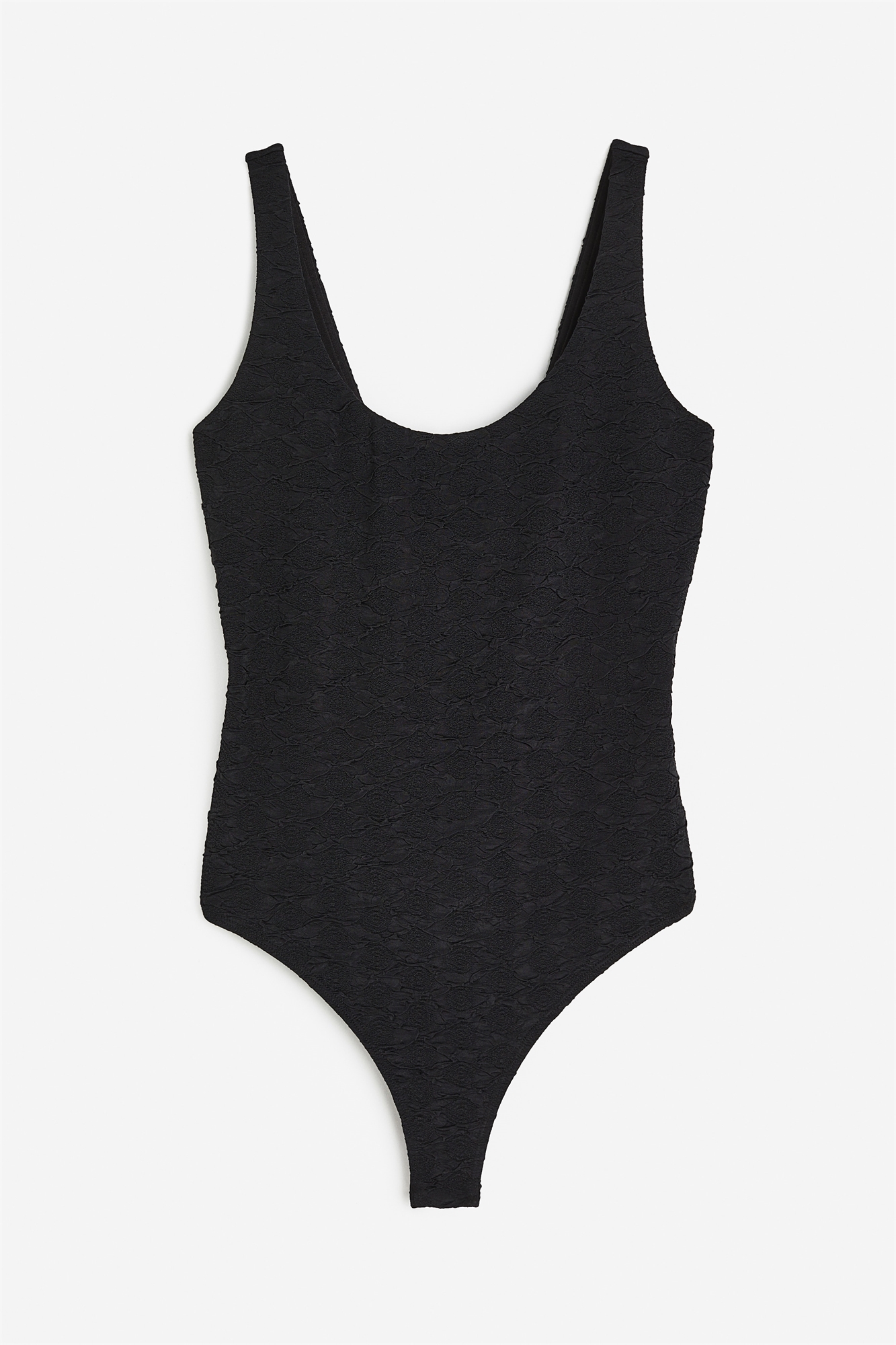 Боди из фактурного джерси с круглым вырезом, глубокой спиной и потайными кнопками в области промежности. Частично на подкладке.