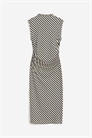 Облегающее платье без рукавов из мягкого трикотажа длиной до середины голени. Небольшой воротник-стойка и потайная застежка-молния на одном плече. Сборка на талии с эффектом драпировки и прямой подол. Без подкладки.