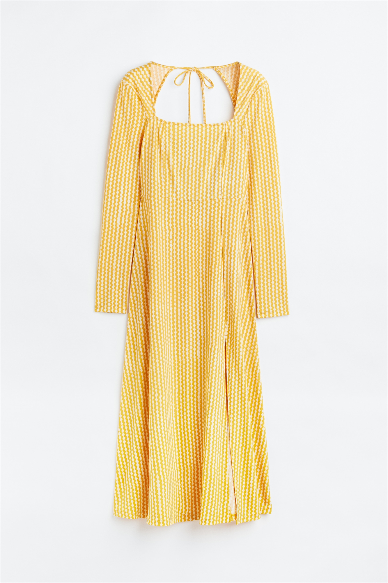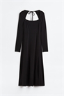 Платье из джерси длиной до колен с квадратным вырезом и длинными рукавами с разрезом на манжетах. Завязки на спине с открытым разрезом и завязками сзади на шее. Облегающий лиф и расклешенная юбка с высоким разрезом.