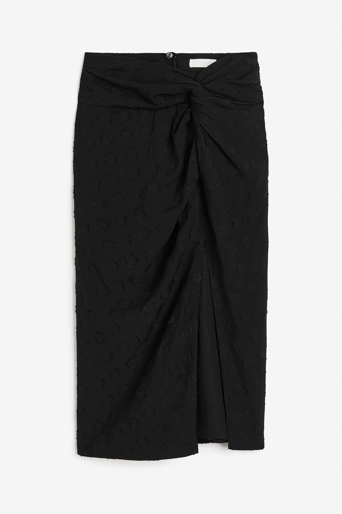Приталенная юбка длиной до колен из тканого материала со сборками по боковым швам в верхней части и декоративной деталью в виде узла на талии, создающей эффект легкой драпировки. Потайная застежка на молнию и пуговицу сзади на талии и высокий разрез спереди на подоле. Без подкладки.