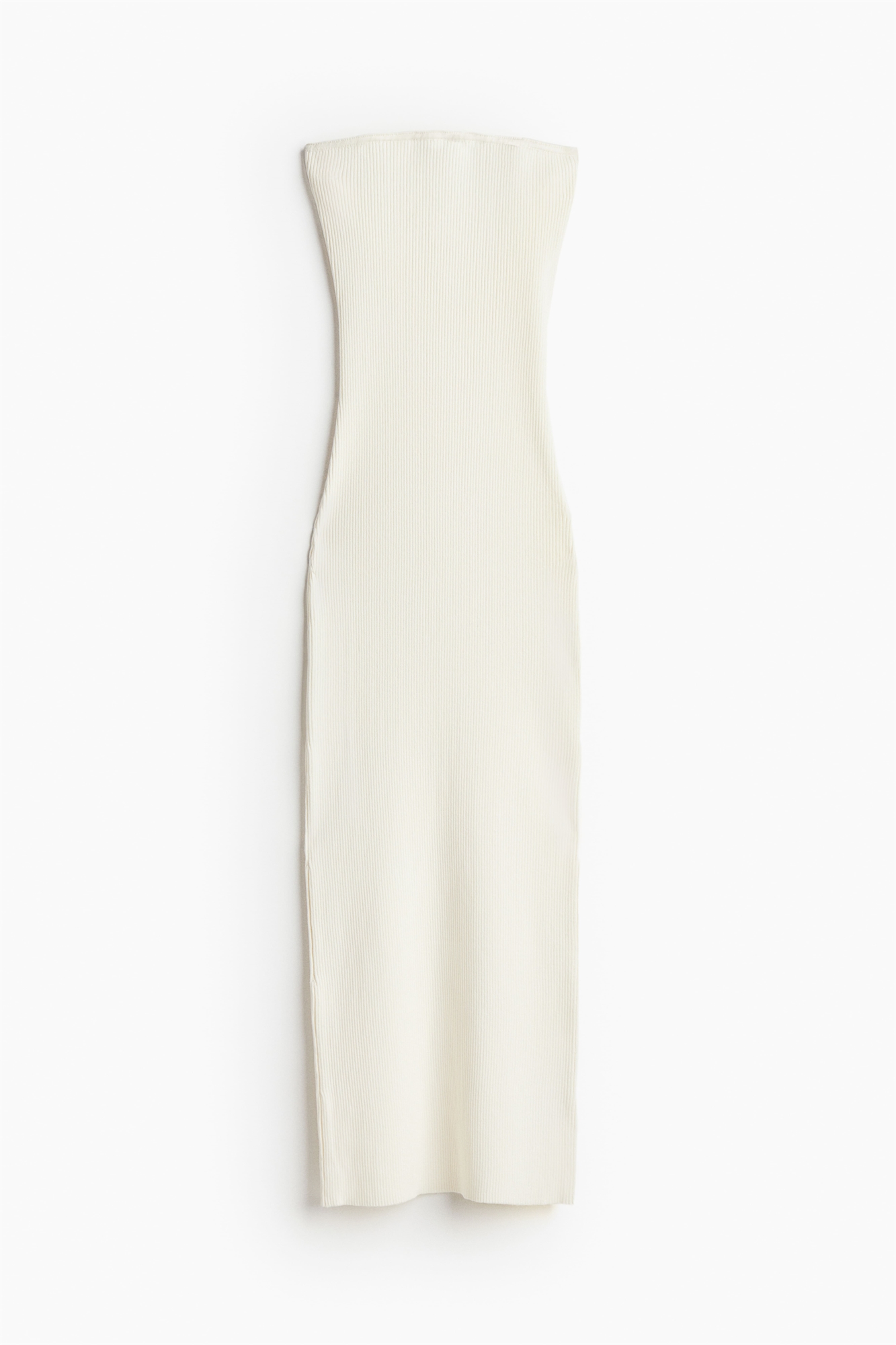 Облегающее платье-труба длиной до колен из плотного ребристого трикотажа со скрытой силиконовой лентой в верхней части для фиксации на месте.