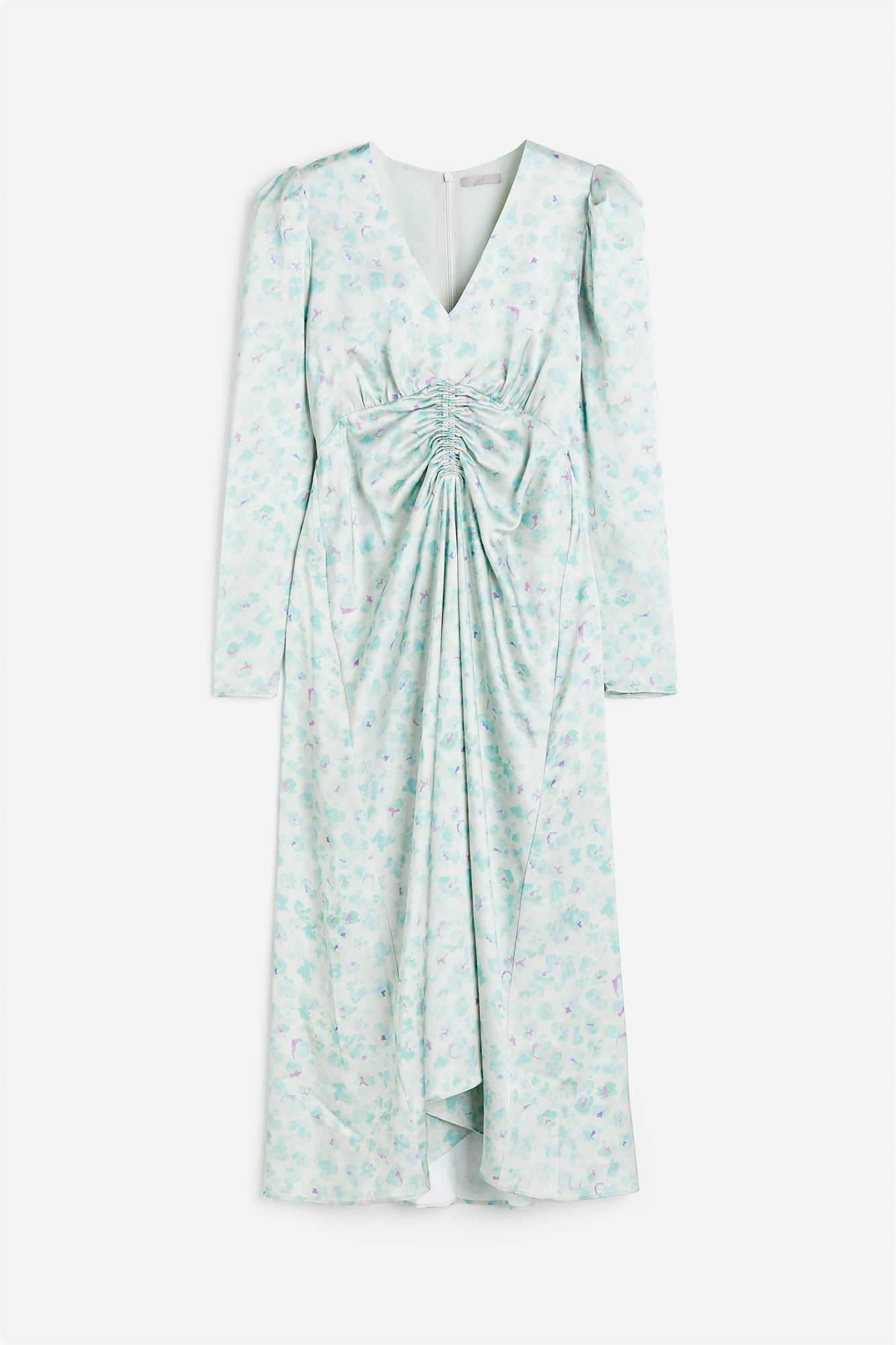 Платье длиной до щиколоток из мягко драпирующегося атласа с глубоким V-образным вырезом. Длинные пышные рукава с подкладками из органзы на плечах для придания объема, разрез и закрытые пуговицы на манжетах. Присборенный шов на талии и эластичный вертикальный шов спереди для создания эффекта рюша. Потайная застежка-молния сзади. На подкладке.