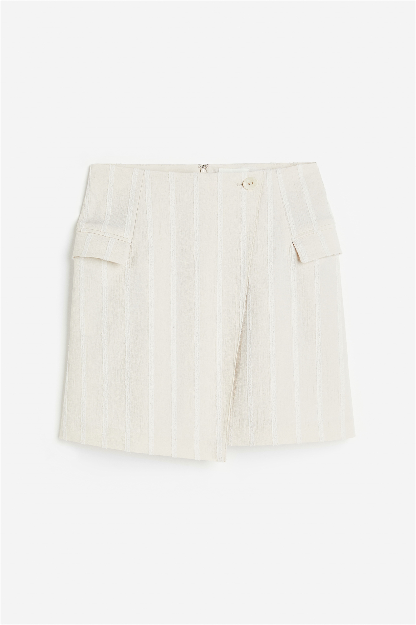 Короткая юбка из фактурного плетения с высокой талией и пришитой обтачкой с пуговицей спереди. Боковые карманы с клапаном и потайная застежка на молнию и крючок с ушком сзади. На подкладке.