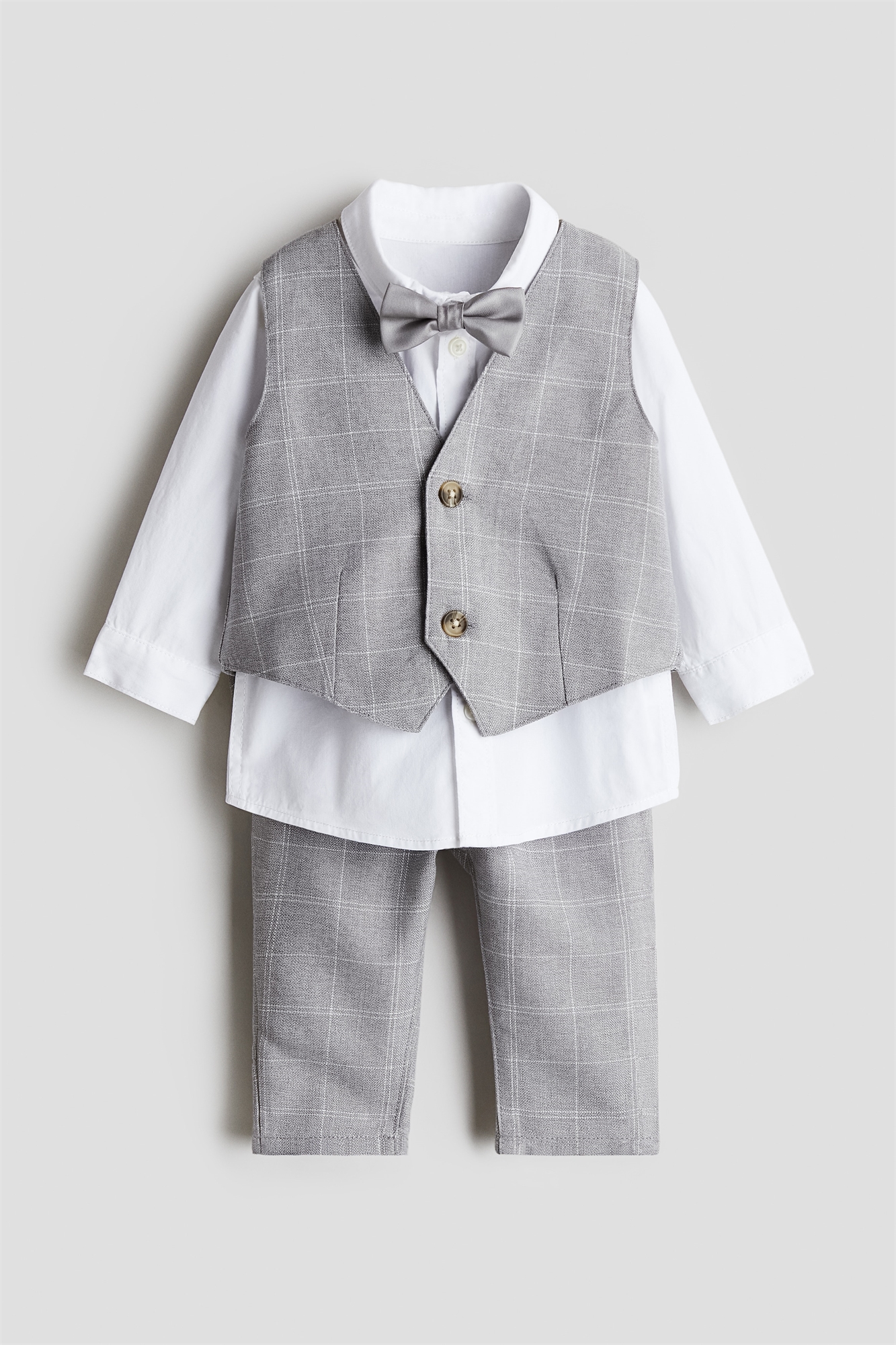 Хорошо одетый комплект, состоящий из пары брюк и подходящего к ним жилета с узорчатым переплетением и рубашки с длинными рукавами и галстуком-бабочкой. Брюки с регулируемым эластичным поясом, фальшивой ширинкой с пуговицей и фальшивыми карманами. Жилет с пуговицами спереди. Рубашка с отложным воротником на пуговицах, передом и пуговицами спереди и на манжетах. Галстук-бабочка с регулируемым эластичным ремешком и пластиковой застежкой сзади.