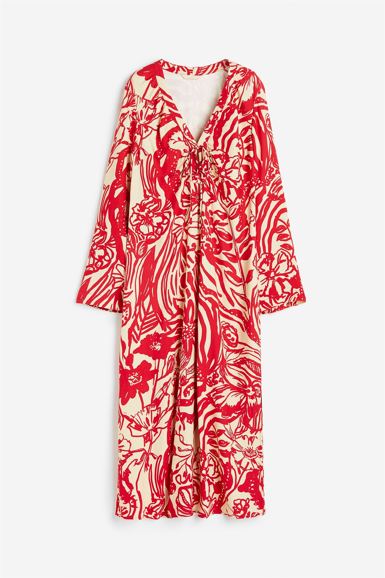 Платье длиной до щиколоток из вискозы с V-образным вырезом и отверстием под ключ с узкими завязками спереди. Длинные широкие рукава и разрез с одной стороны подола. Без подкладки.