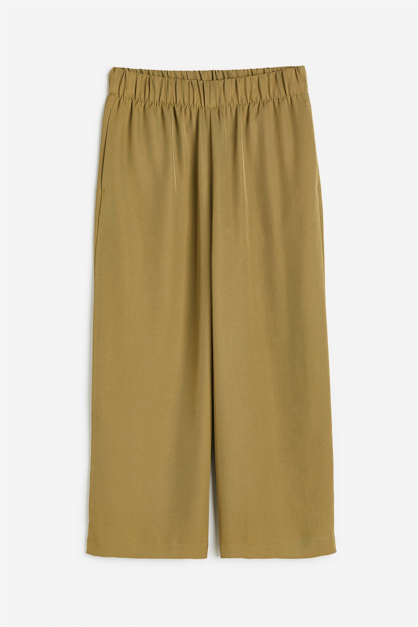 Кюлоты из тканого материала. Регулярная талия с утяжкой, незаметные карманы в боковых швах и фальшивые задние карманы. Свободный крой с прямыми ногами.