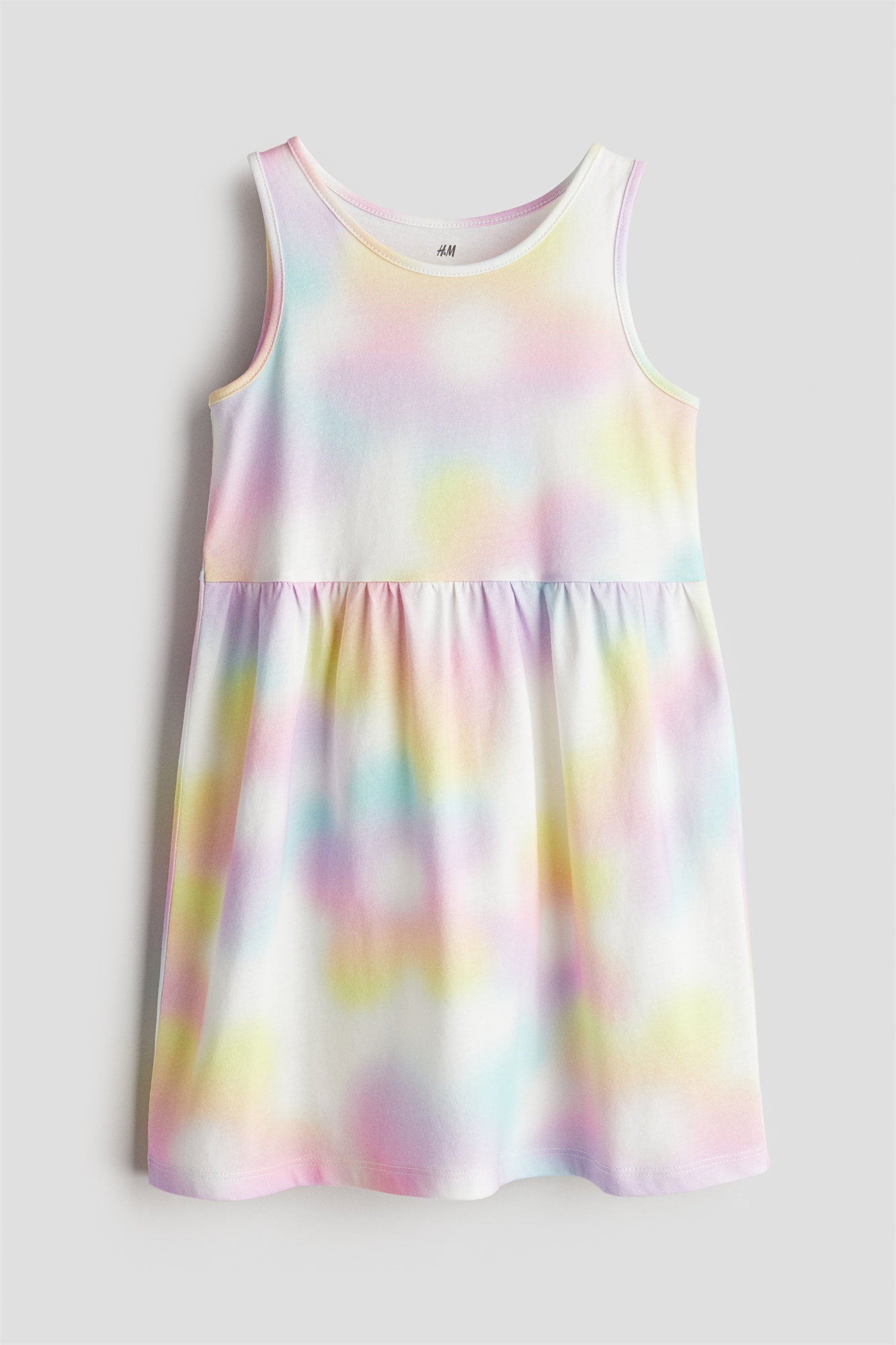 Удобное платье без рукавов из мягкого хлопкового джерси с рисунком, со сборкой на талии и расклешенной юбкой.