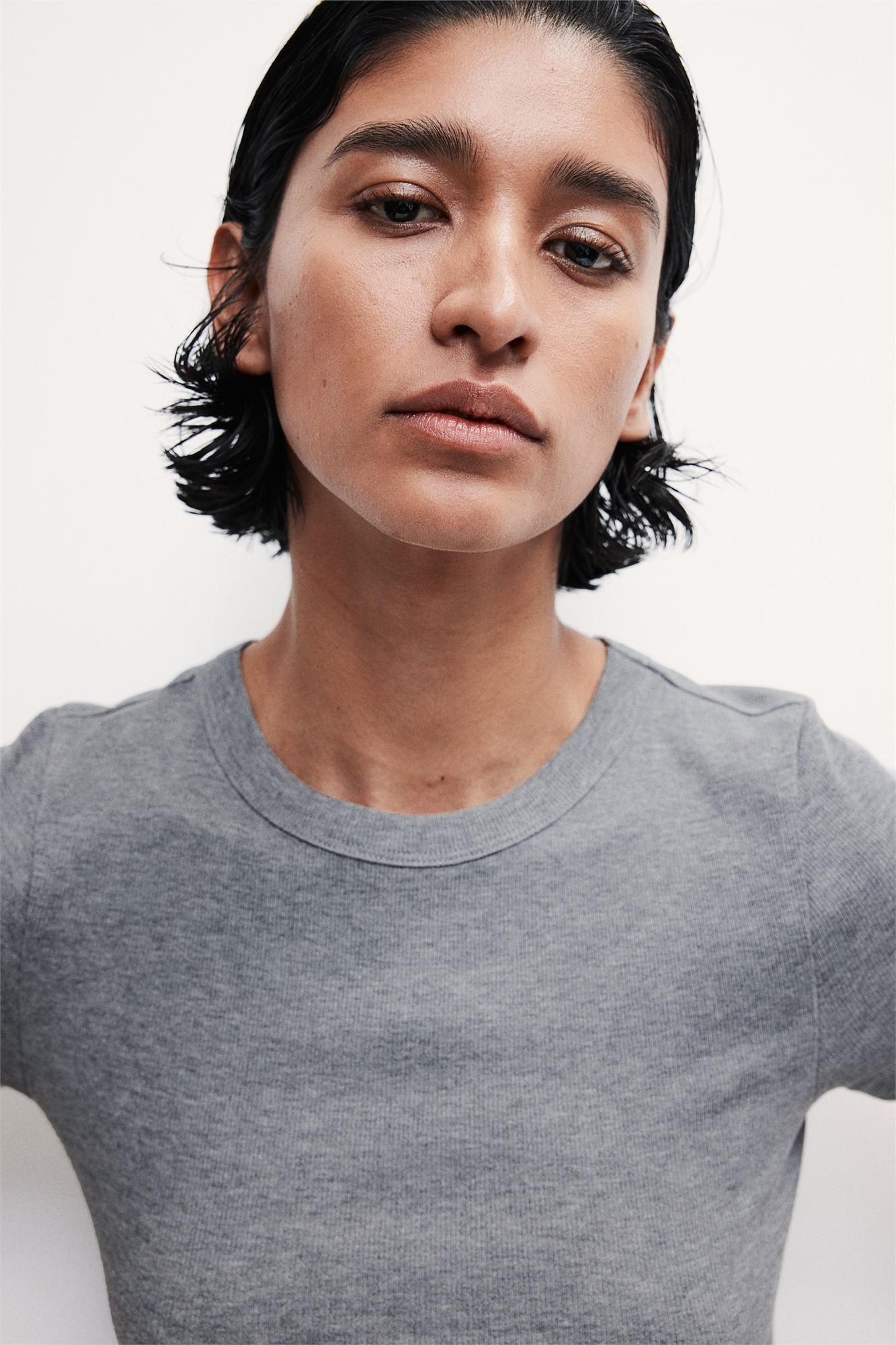 Облегающая футболка из мягкого джерси из смеси хлопка и модала с узкой окантовкой по вырезу горловины и прямым подолом.