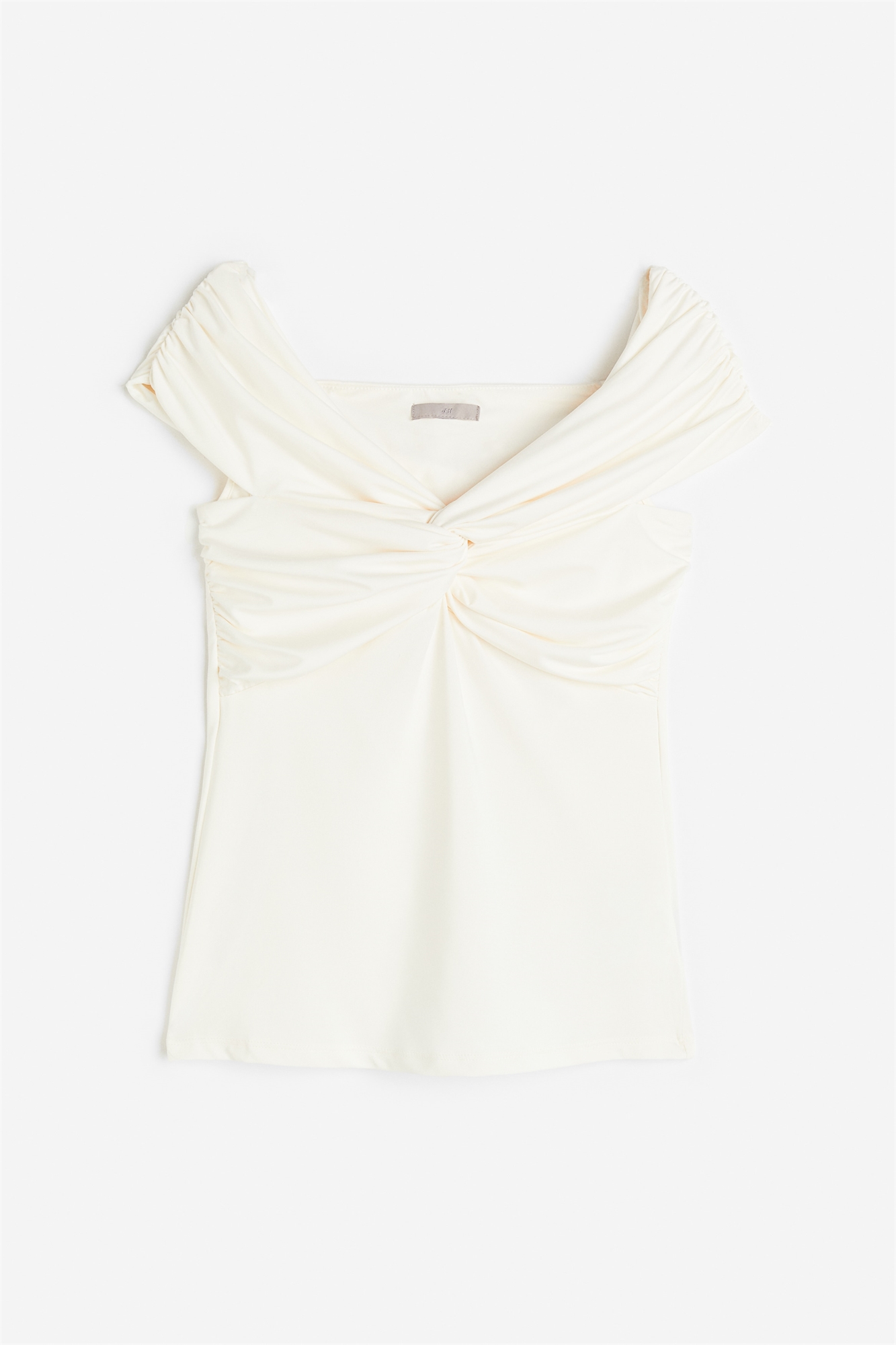 Облегающий топ без плеч из мягкого трикотажа с короткими рукавами и декоративной деталью в виде узла спереди для создания эффекта легкой драпировки.
