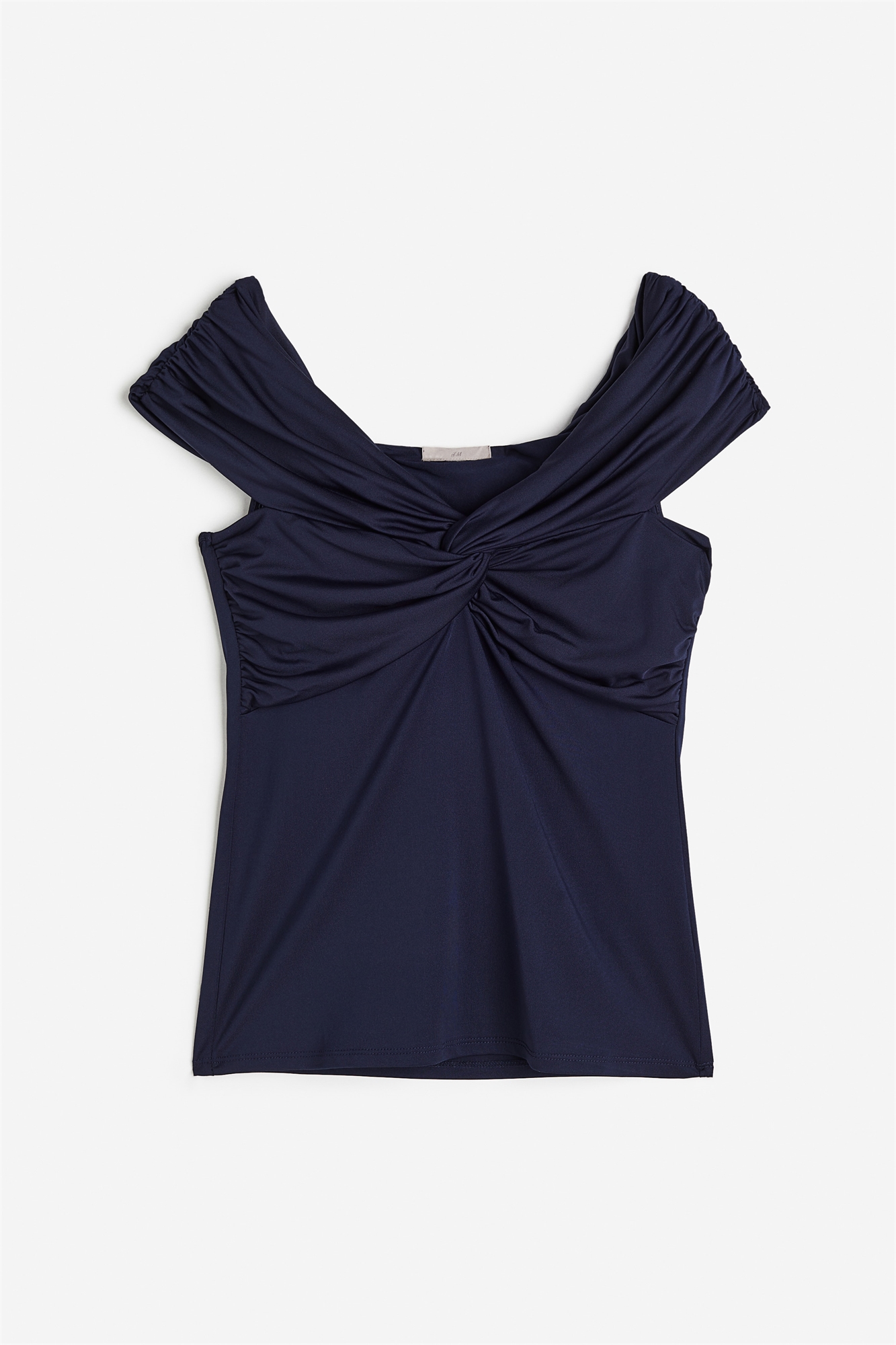 Облегающий топ без плеч из мягкого трикотажа с короткими рукавами и декоративной деталью в виде узла спереди для создания эффекта легкой драпировки.