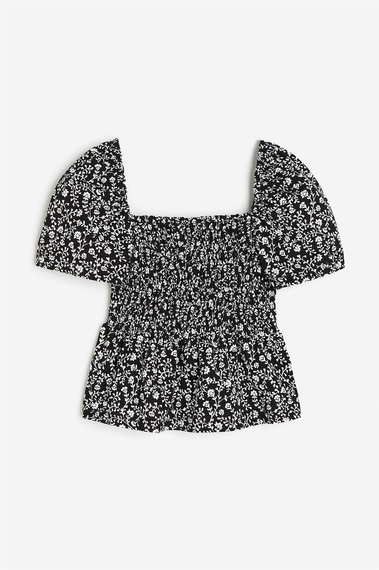 Облегающий топ из мягкого хлопкового джерси с короткими пышными рукавами и квадратным, эластичным вырезом спереди и сзади. Лиф с отделкой "мокасины" и мягко расклешенный пеплум.