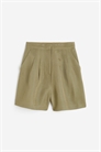 Шорты из вискозы и льняного полотна с высокой эластичной талией, ширинкой на молнии и потайной застежкой на пуговицы и крючки и глазки. Диагональные боковые карманы и втачные карманы сзади. Широкие ноги со складками в верхней части.