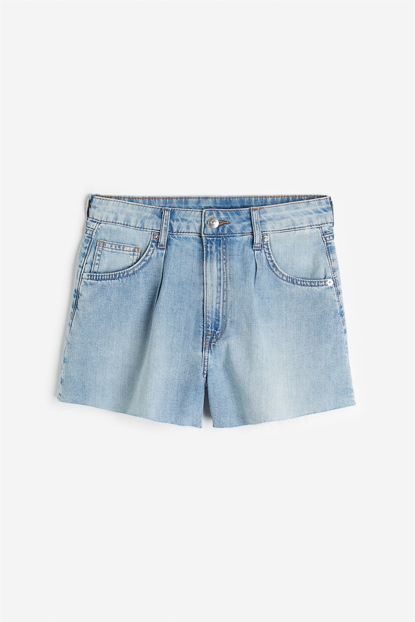 Шорты с 5 карманами из жесткого хлопкового денима с высокой талией, складками в верхней части, застежкой на молнию и пуговицу и необработанными краями.