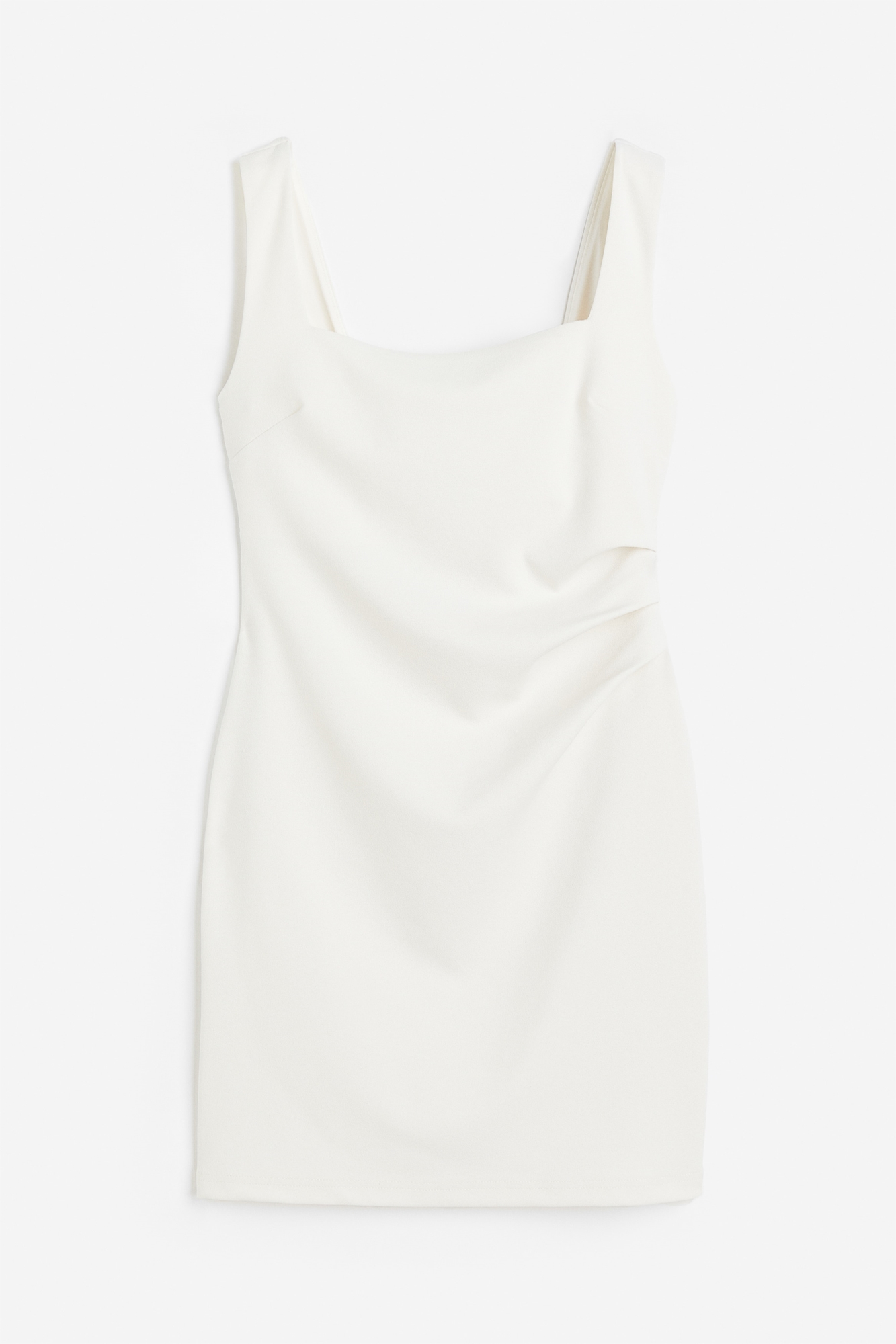 Короткое приталенное платье без рукавов из джерси с широкими бретелями и квадратным вырезом спереди и сзади. Складки на талии с одной стороны создают эффект легкой драпировки. Сверху на подкладке.