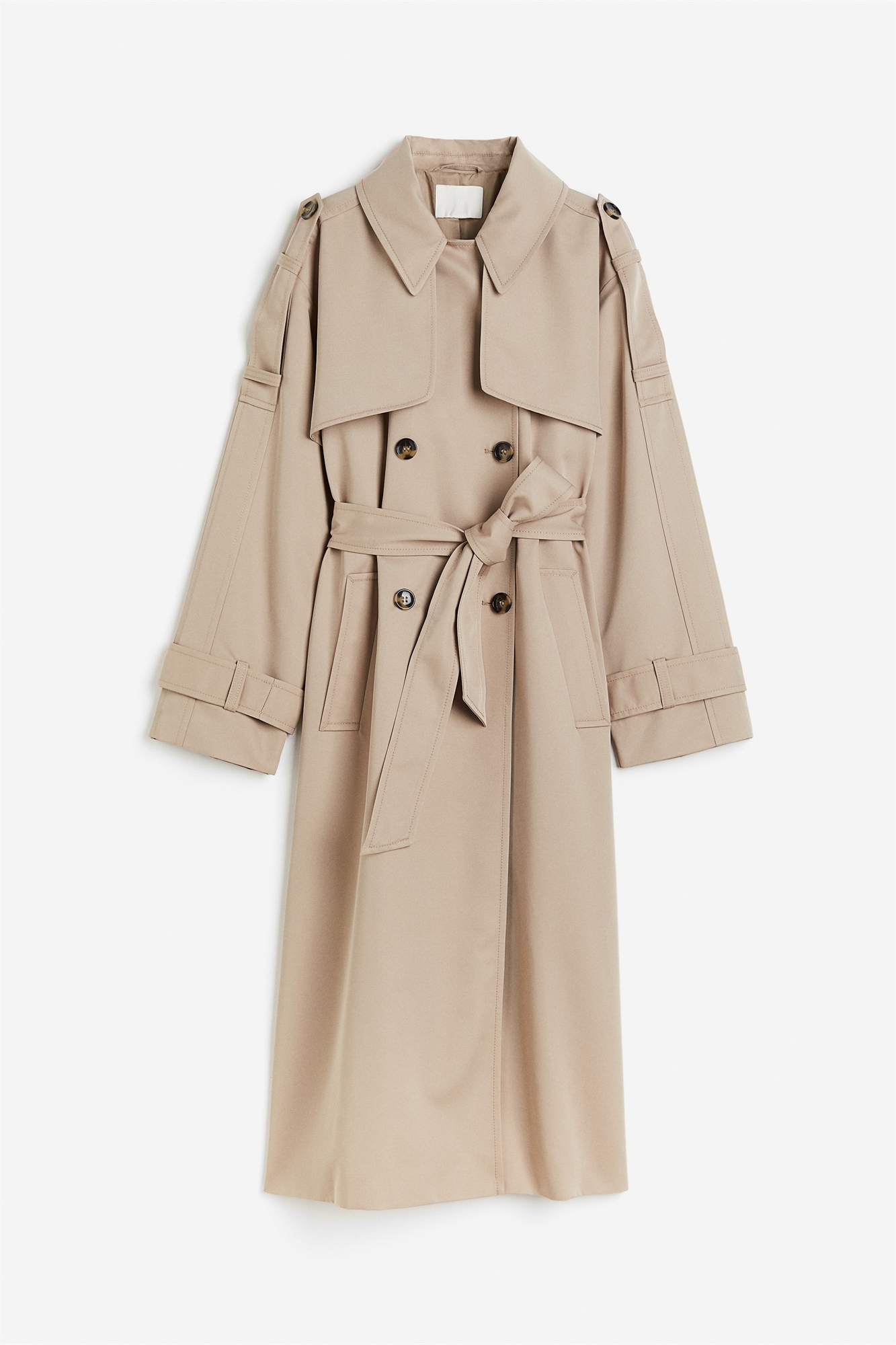 Двубортный тренч длиной до щиколоток из тканого материала с воротником, широкими лацканами и пуговицами спереди. Свободный крой со штормовыми клапанами спереди и свободным коромыслом сзади. Длинные рукава с декоративными вставками на плечах и манжетах. Съемный пояс-завязка на талии, диагональные карманы спереди и один задний клапан. На подкладке.