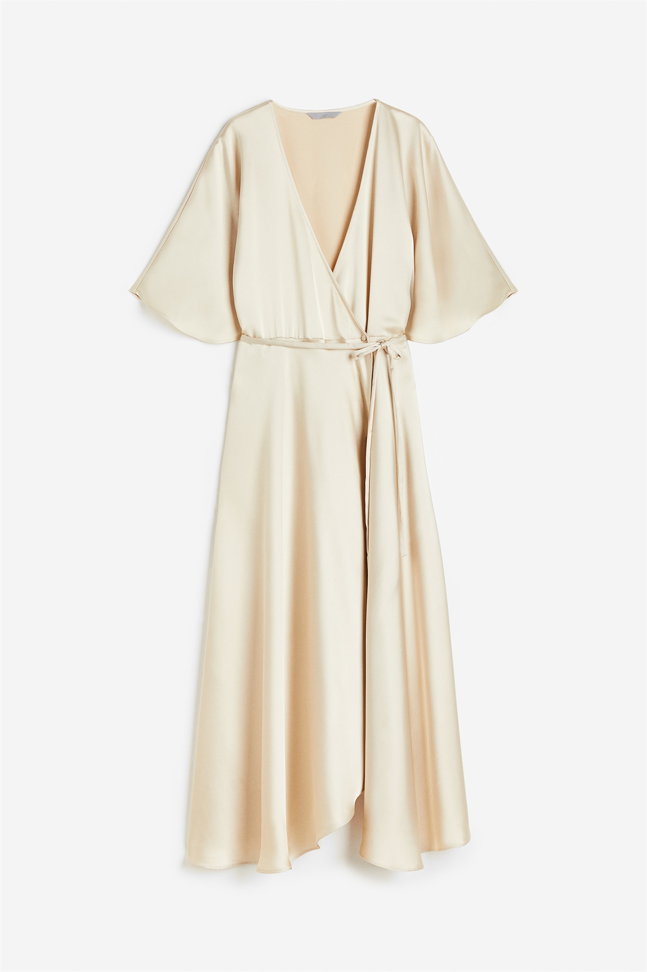 Платье длиной до колена из мягко драпирующегося атласа с глубоким V-образным вырезом и короткими широкими рукавами. Застегивается на пуговицы спереди и завязывается узким поясом на талии. Без подкладки.