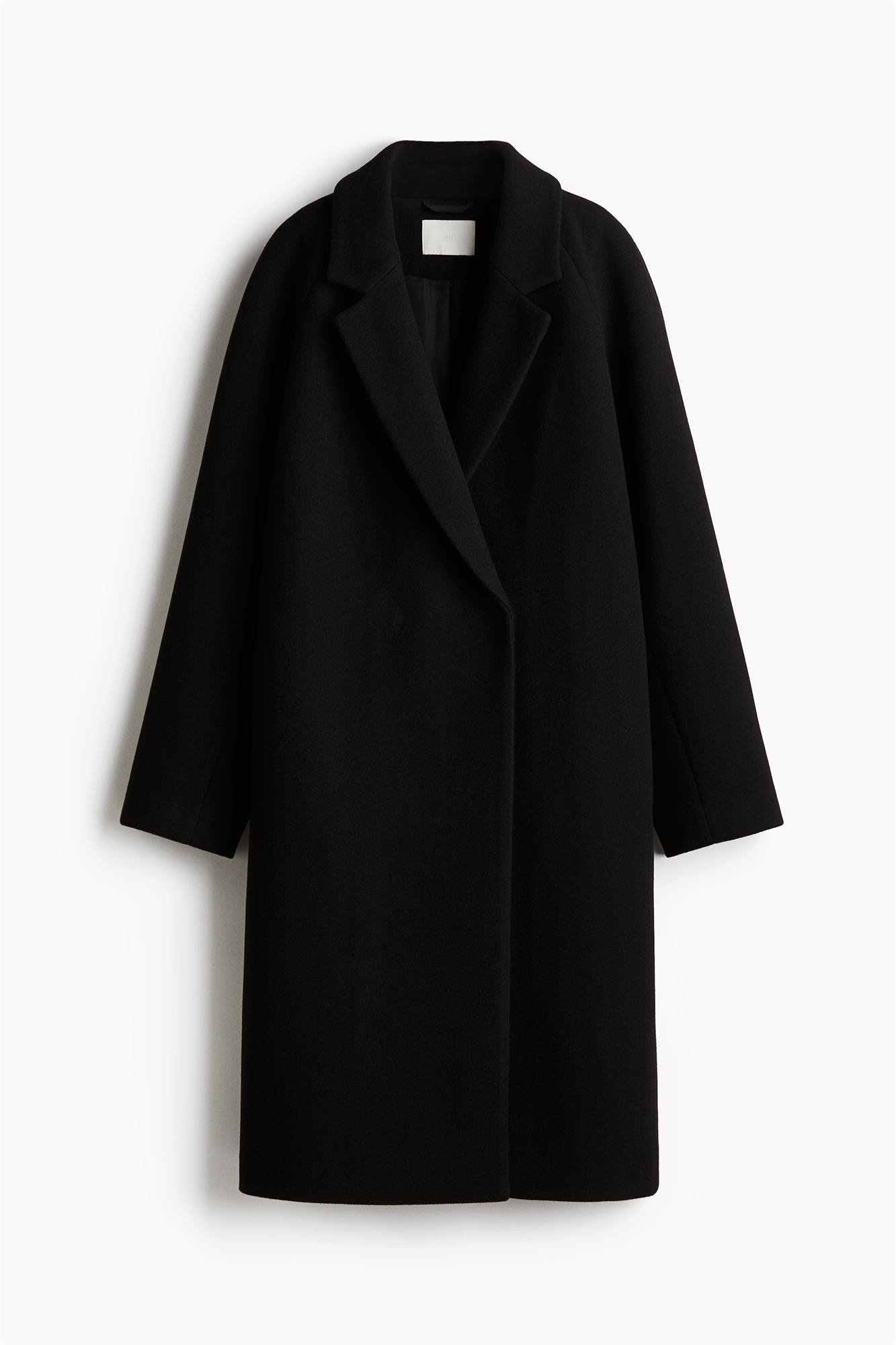 Двубортное пальто длиной до колена из тканого материала с лацканами с вырезом и потайными пуговицами спереди. Длинные рукава реглан, неброские боковые карманы и один задний клапан. На подкладке.