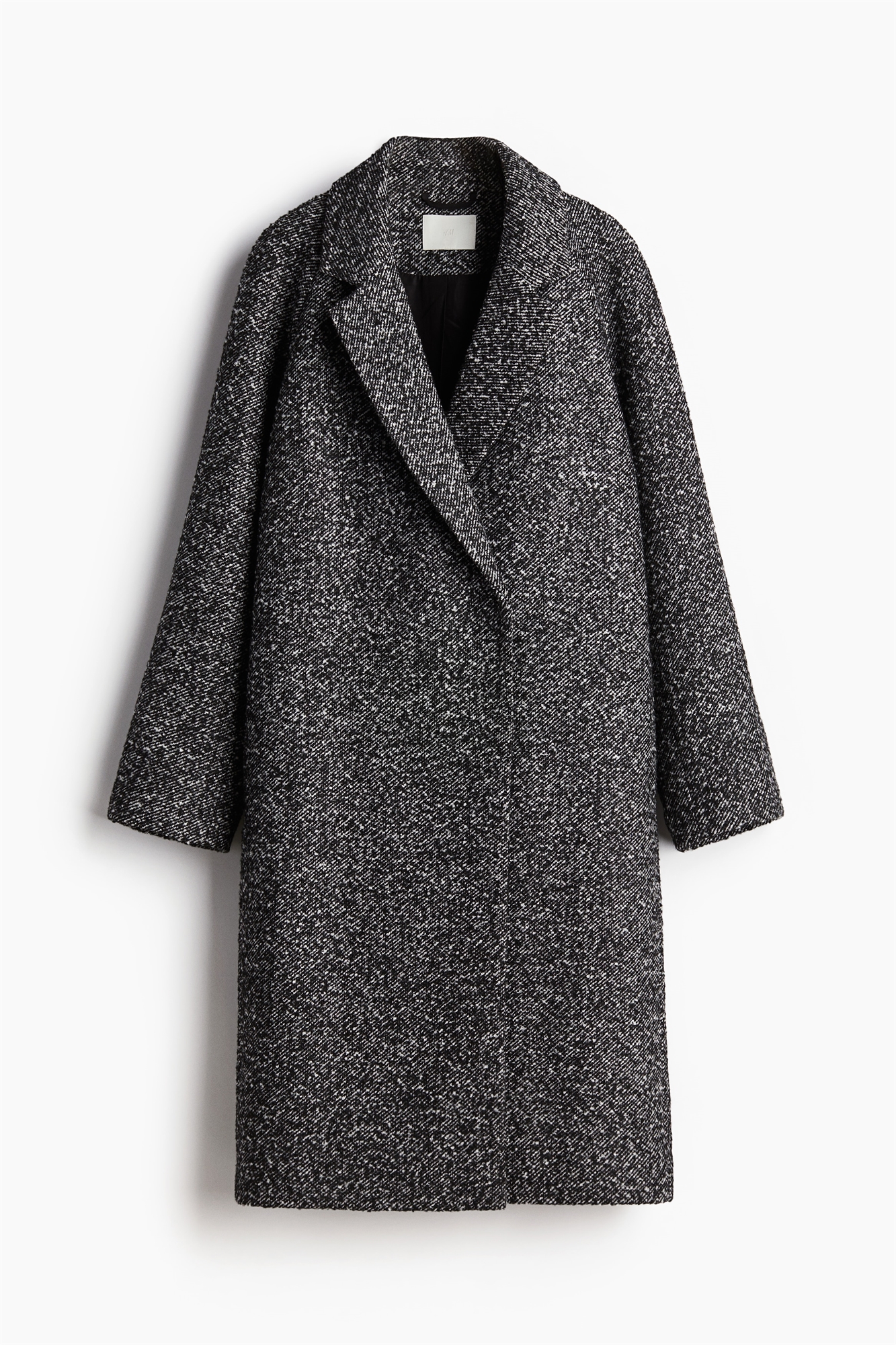 Двубортное пальто длиной до колена из тканого материала с лацканами с вырезом и потайными пуговицами спереди. Длинные рукава реглан, неброские боковые карманы и один задний клапан. На подкладке.