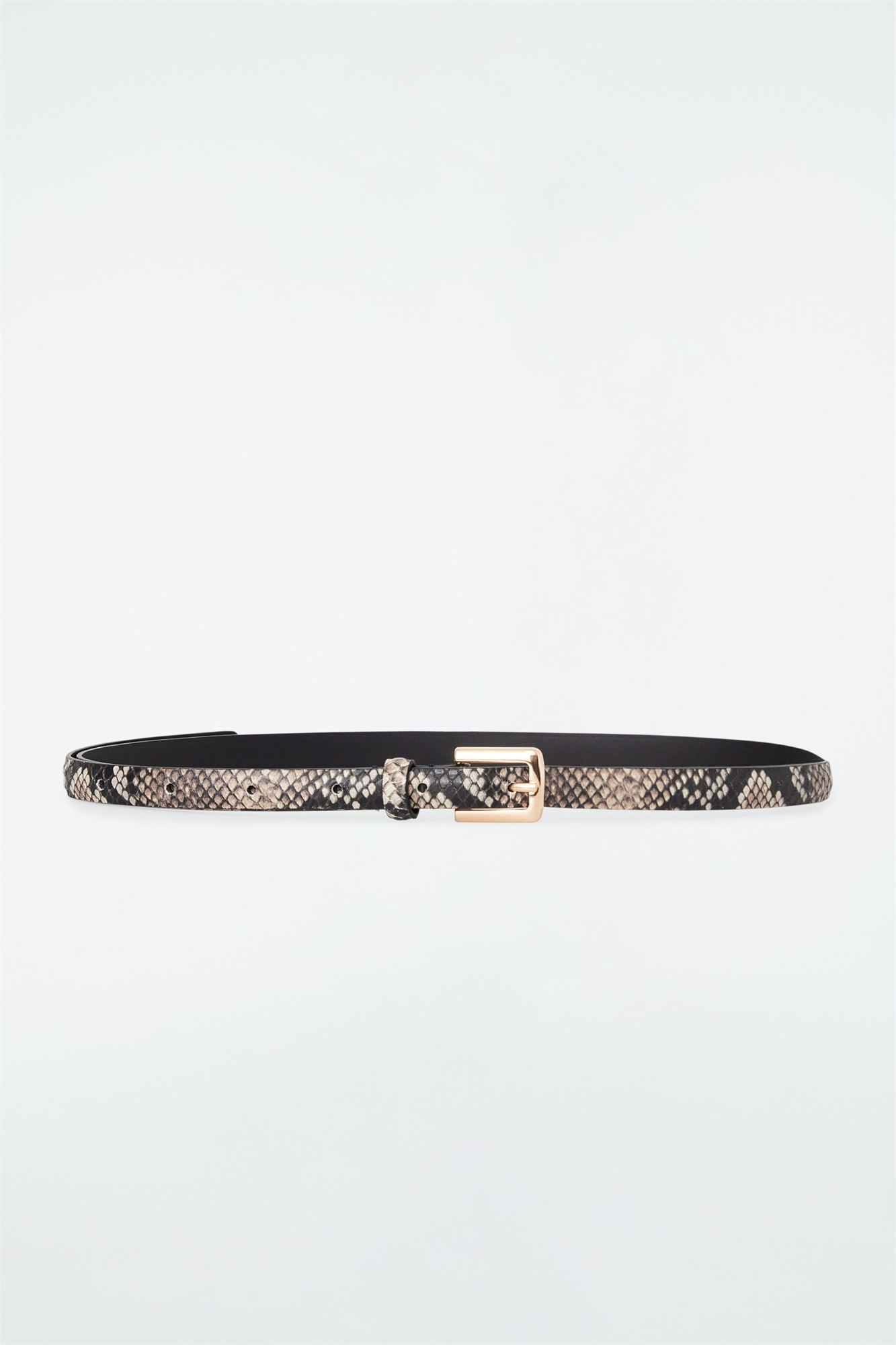 Классический ремень - вечный способ дополнить наряд. Этот тонкий ремень изготовлен в Италии из кожи с эффектом змеиной кожи и застегивается D-образной пряжкой золотого цвета. Застежка на пряжке Кожаный держатель COS поддерживает ответственное производство через Leather Working Group Материал: 100% кожа. Без учета отделки Длина: XS/S - 77 см, M/L - 89 см.