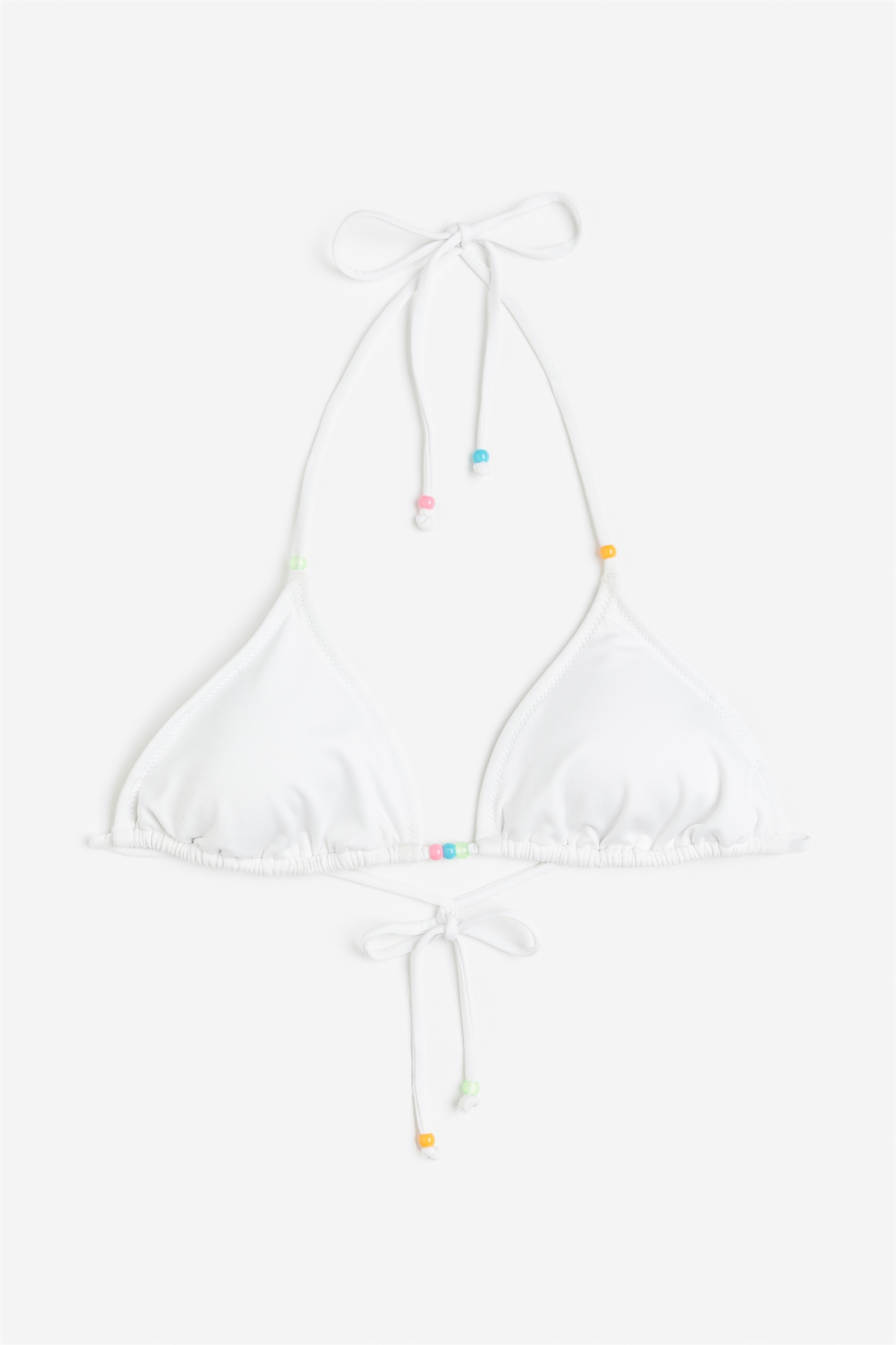 Бикини-треугольник с мягкой подкладкой, с узкими регулируемыми бретелями и чашечками со съемными вкладышами, которые придают груди форму и хорошо поддерживают ее. Завязки на шее и на спине.
