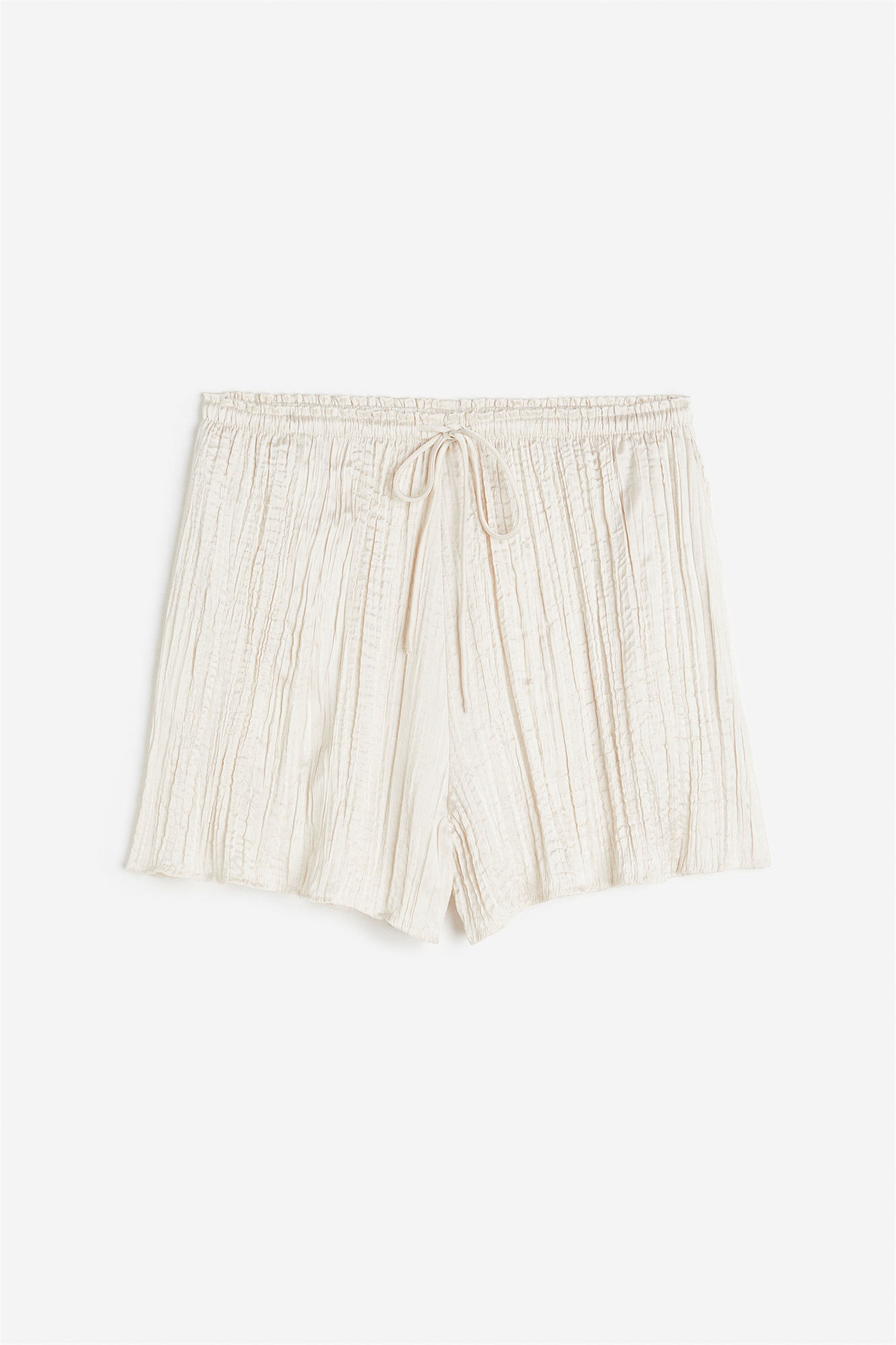 Свободные шорты из плиссированного атласа с диагональными боковыми карманами. Высокая талия с эластичной отделкой и завязкой-спагетти.