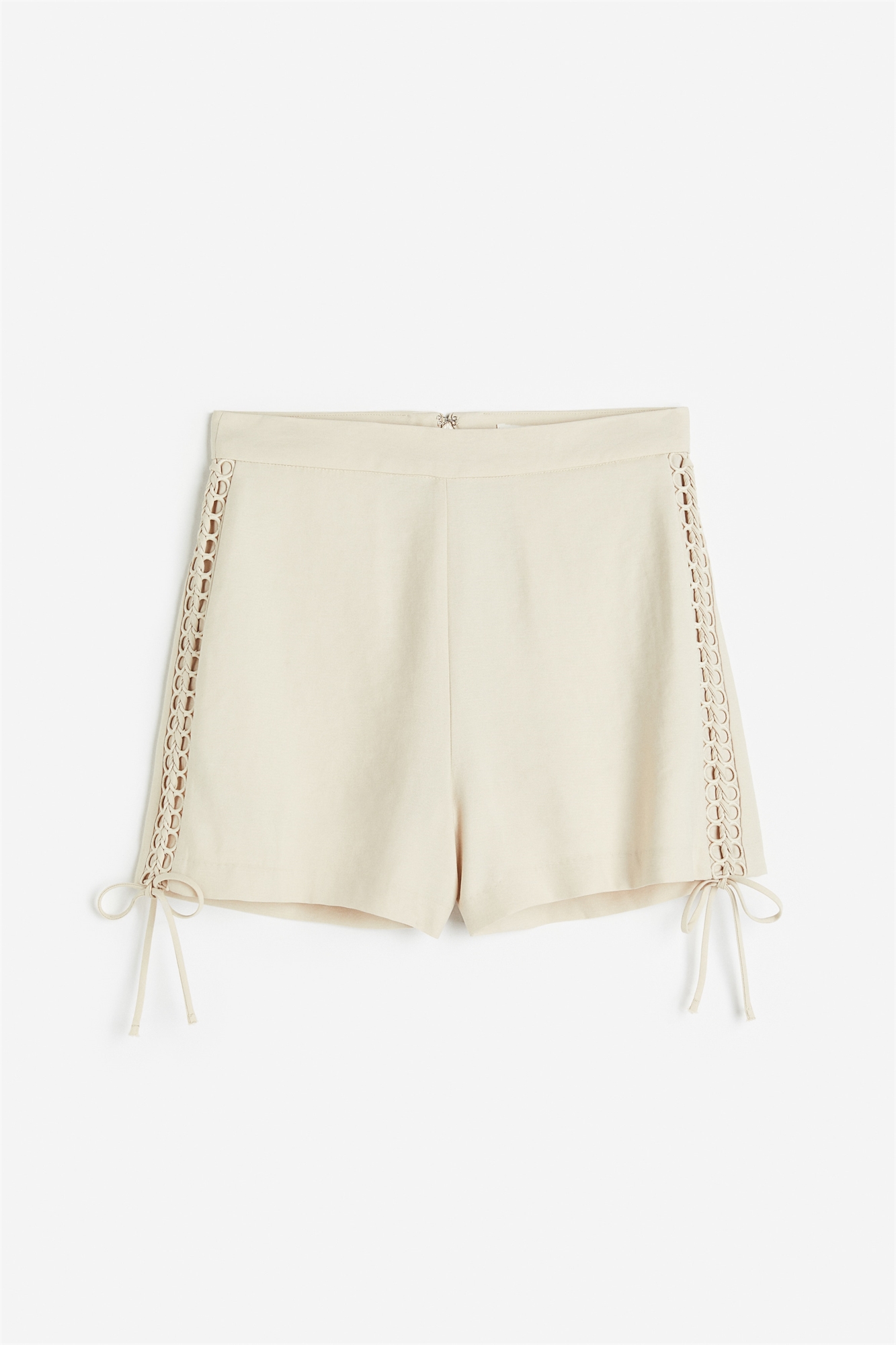 Шорты из вискозной смеси. Высокий пояс со скрытой застежкой на молнию и крючок сзади. Неприметные карманы в боковых швах и боковая отделка из круглых петель.