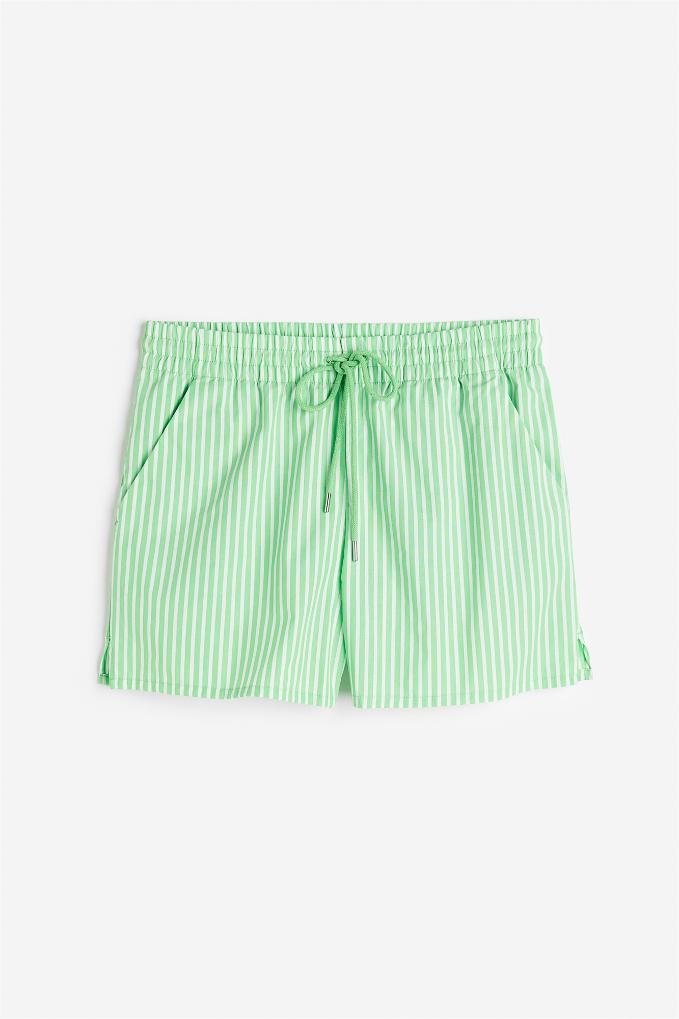 Свободные шорты из тканого материала с эластичным поясом, косыми боковыми карманами и небольшим разрезом на концах штанин.
