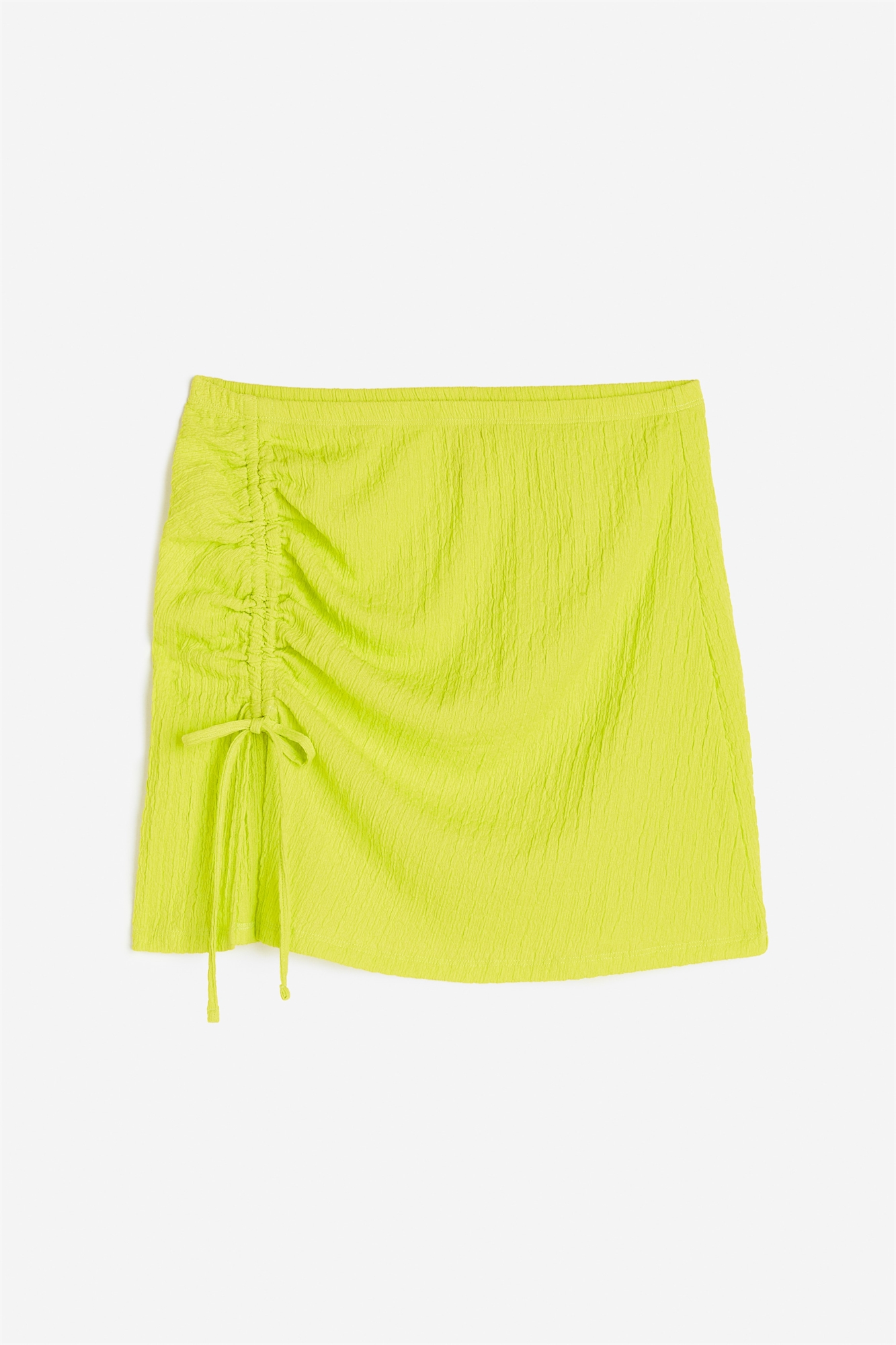 Короткая пляжная юбка из жаккардовой ткани с утягивающим шнурком сбоку, который превращается в разрез. Пояс на талии с узким эластичным шнурком.