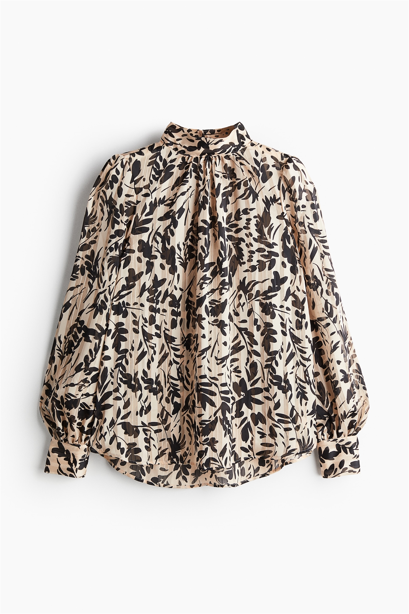 Узорчатая блузка из легкого крепа с небольшим воротником-стойкой и прорезью для ключа с закрытыми пуговицами сзади на шее. Длинные рукава со сборками на плечах и манжетами с пуговицами. Аккуратный закругленный подол.