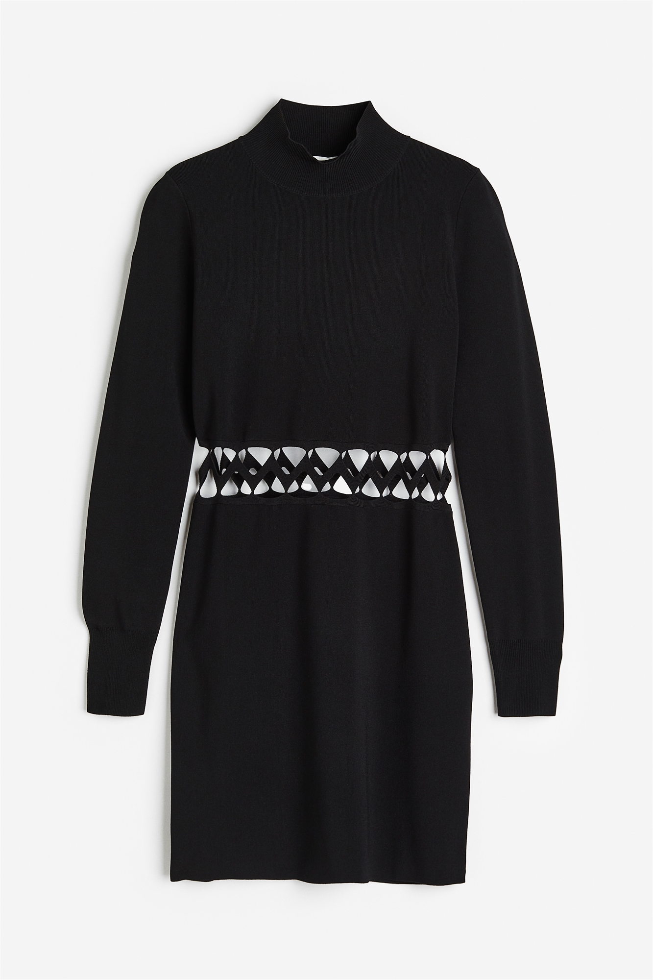 Короткое приталенное платье из мягкого трикотажа с черепаховой горловиной, длинными рукавами с широкими манжетами и вырезом на талии.