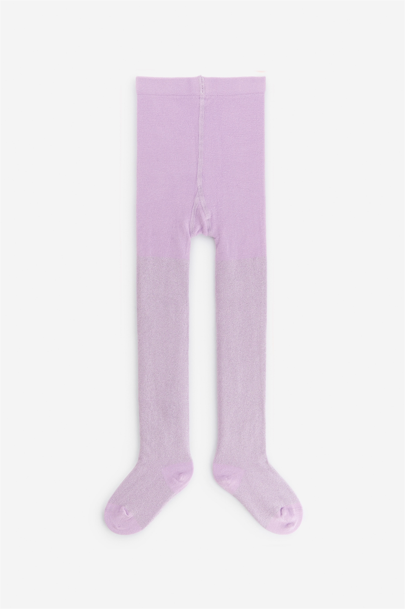 Трикотажные колготки из хлопковой смеси с металлической нитью для придания эффекта блеска. Колготки имеют обычную посадку, средний подъем и усиленные мысок и пятку.