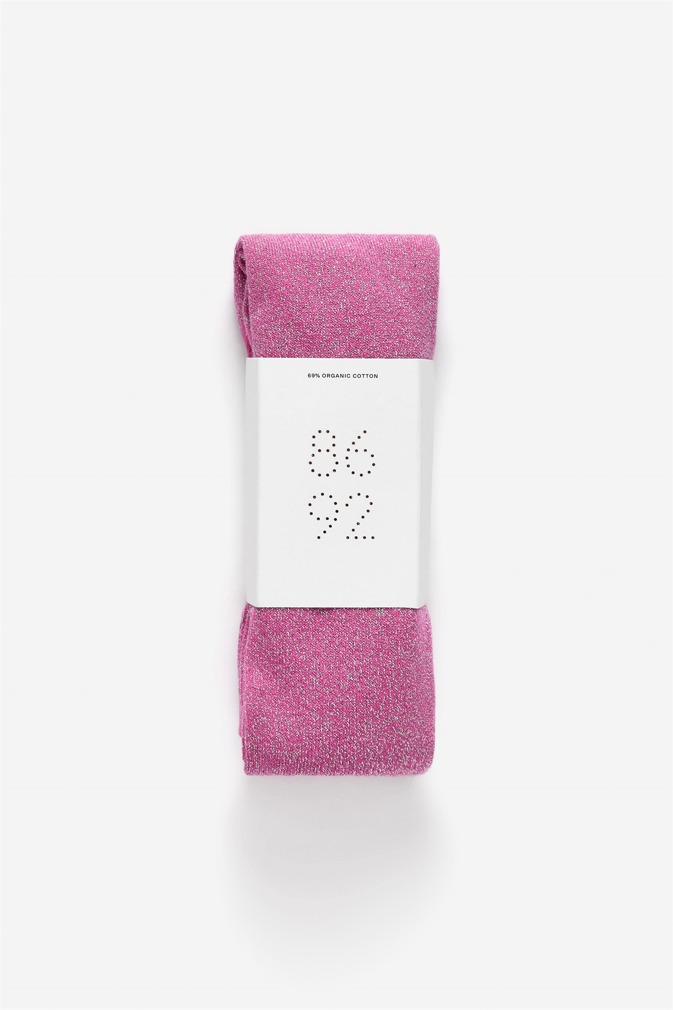Трикотажные колготки из хлопковой смеси с металлической нитью для придания эффекта блеска. Колготки имеют обычную посадку, средний подъем и усиленные мысок и пятку.