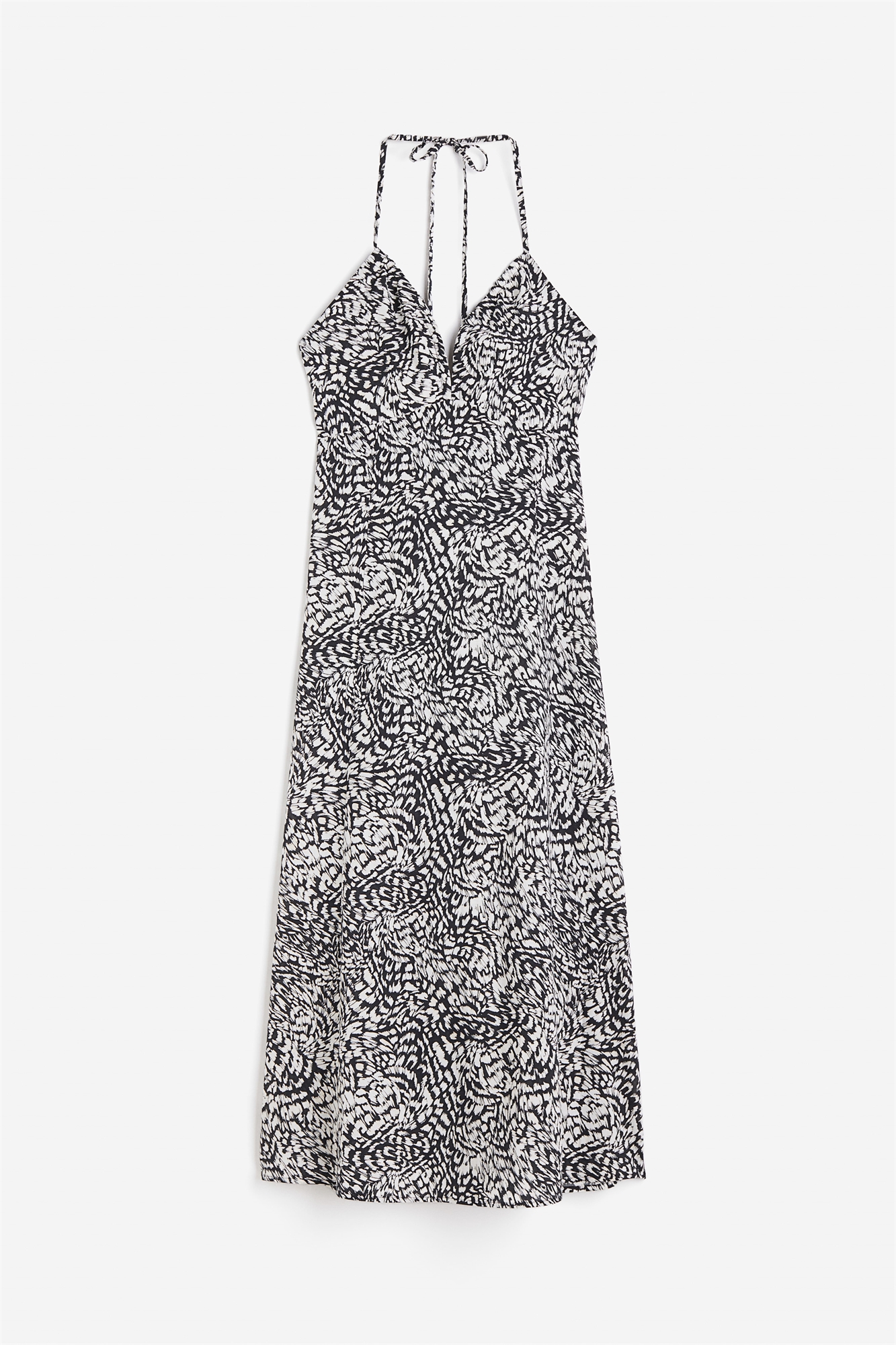 Платье длиной до колен из хлопкового полотна. Горловина халтер с завязками спереди и узкими завязками, застегивающимися сзади на шее. Облегающий лиф с платочной вставкой сзади. Шов под бюстом и слегка расклешенная юбка. Без подкладки.