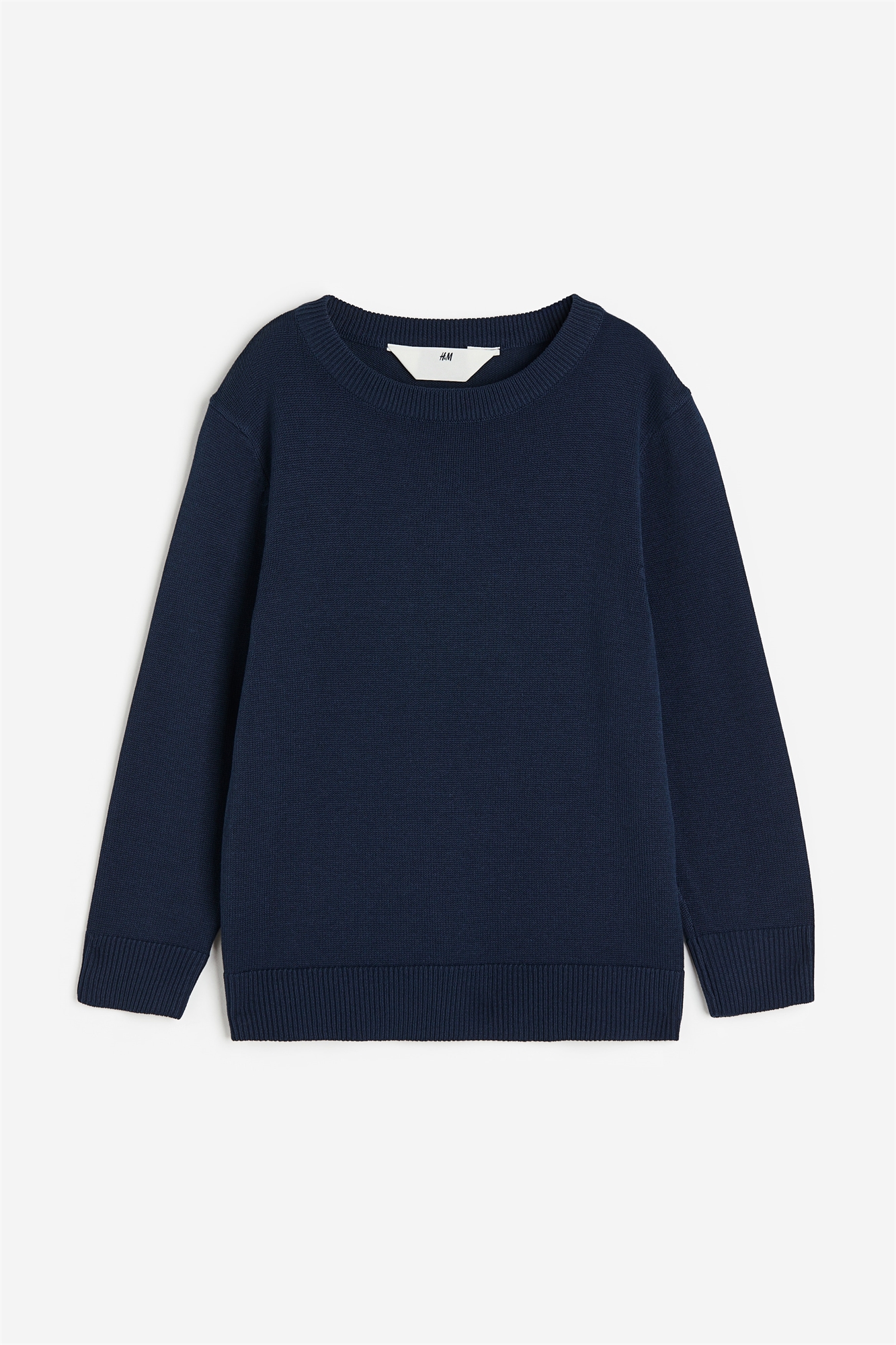 Джемпер из мягкого хлопка тонкой вязки с круглым вырезом в рубчик, длинными рукавами и рубчиками на манжетах и подоле.