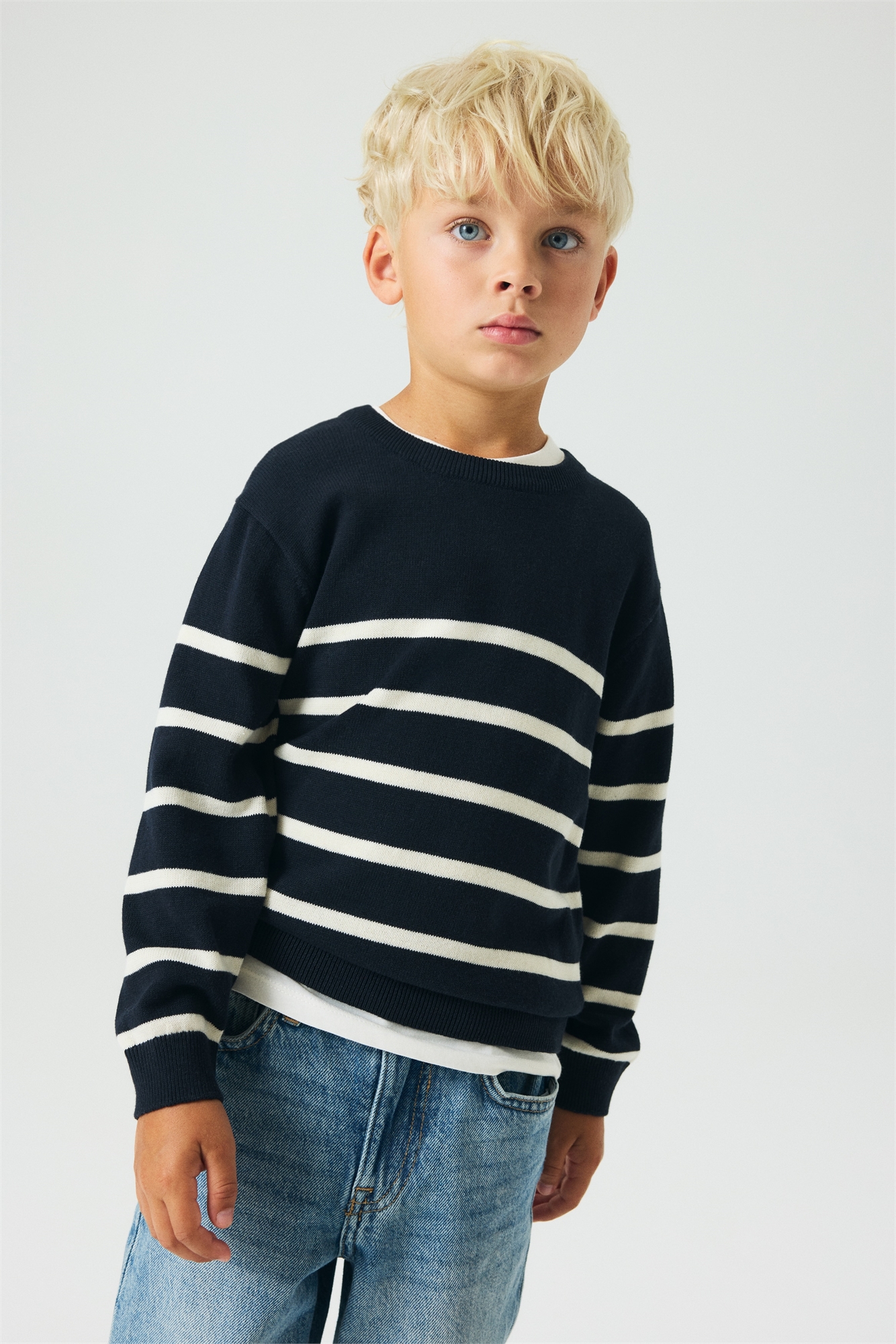 Джемпер из мягкого хлопка тонкой вязки с круглым вырезом в рубчик, длинными рукавами и рубчиками на манжетах и подоле.